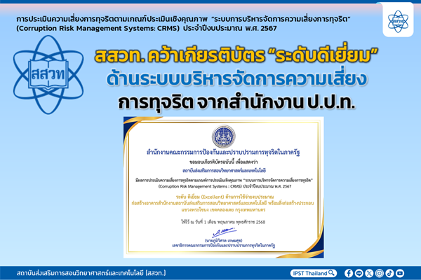 สสวท. คว้าเกียรติบัตร “ระดับดีเยี่ยม” ด้านระบบบริหารจัดการความเสี่ยงการทุจริต จากสำนักงาน ป.ป.ท. 1 กรกฎาคม 2568 แก้ไขล่าสุดเมื่อ: (แก้ไข 2 กรกฎาคม 2025)