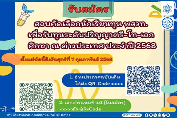 สสวท. ประกาศรับสมัครสอบคัดเลือกเพื่อรับทุน พสวท. ระดับปริญญาตรี-โท-เอก ศึกษา ณ ต่างประเทศ ประจำปีการศึกษา 2568 22 มกราคม 2568 แก้ไขล่าสุดเมื่อ: (แก้ไข 22 มกราคม 2025)