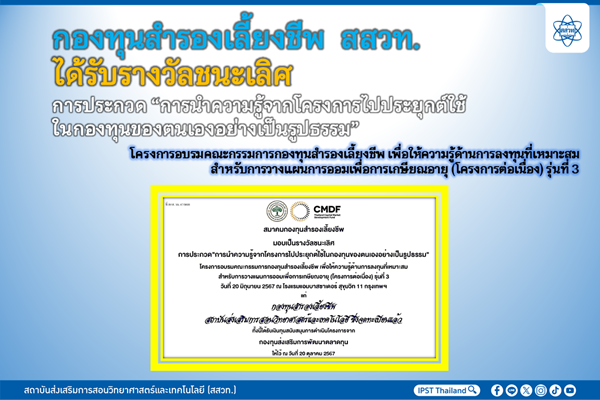 กองทุนสำรองเลี้ยงชีพ สสวท. ได้รับรางวัลชนะเลิศ การประกวด “การนำความรู้จากโครงการไปประยุกต์ใช้ในกองทุนของตนเองอย่างเป็นรูปธรรม” 21 ตุลาคม 2567 แก้ไขล่าสุดเมื่อ: (แก้ไข 22 ตุลาคม 2024)
