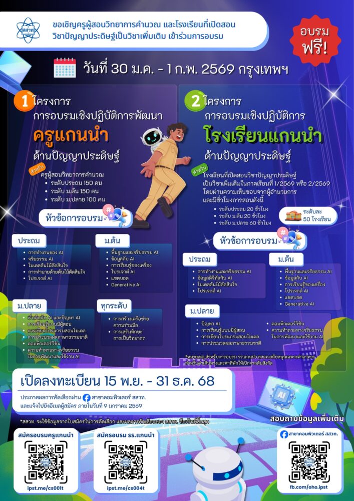 สถาบันส่งเสริมการสอนวิทยาศาสตร์และเทคโนโลยี (สสวท.) ขอเชิญชวนครูผู้สอนวิทยาการคำนวณและโรงเรียนที่เปิดสอนวิชาปัญญาประดิษฐ์เป็นวิชาเพิ่มเติมทั่วประเทศ เข้าร่วมอบมรมฟรี “โครงการอบรมเชิงปฏิบัติการ ระหว่างวันที่ 30 มกราคม – 1กุมภาพันธ์ 2569 กรุงเทพฯ เพื่อยกระดับความรู้และทักษะด้านปัญญาประดิษฐ์ (AI) ในระบบการศึกษาไทย โดยเปิดรับสมัคร 2 โครงการหลัก คือ โครงการอบรมเชิงปฏิบัติการพัฒนาครูแกนนำด้านปัญญาประดิษฐ์ สำหรับครูผู้สอนรายวิชาเทคโนโลยี (วิทยาการคำนวณ)ทุกระดับชั้น (ประถม-มัธยม) จำนวน 400 คน สมัครได้ที่ https://ipst.me/cs001t และโครงการอบรมเชิงปฏิบัติการพัฒนาโรงเรียนแกนนำด้านปัญญาประดิษฐ์ สำหรับโรงเรียนที่พร้อมเปิดสอนวิชา AI เป็นวิชาเพิ่มเติมในภาคเรียนที่ 1/2569 หรือ 2/2569 จำนวน 50 โรงเรียน สมัครได้ที่ https://ipst.me/cs004t ตั้งแต่วันนี้ – 31 ธันวาคม 2568 สอบถามและประกาศผลการคัดเลือกที่ Facebook สาขาคอมพิวเตอร์ สสวท. https://www.facebook.com/oho.ipst