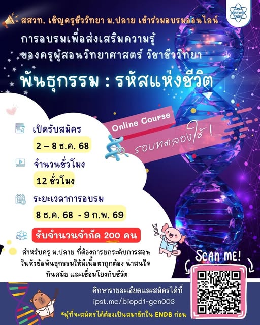 สสวท. เชิญครูชีววิทยา ม.ปลาย เข้าร่วมสมัครการอบรมเพื่อส่งเสริมความรู้ของครูผู้สอนวิทยาศาสตร์ วิชาชีววิทยา พันธุกรรม : รหัสแห่งชีวิต (ทดลองใช้) ออนไลน์
