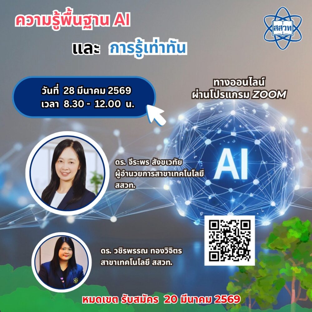 สถาบันส่งเสริมการสอนวิทยาศาสตร์และเทคโนโลยี (สสวท.) โดยโครงการ GLOBE ฝ่ายพัฒนาครูและบุคลากรทางการศึกษา เปิดรับสมัครครูเข้าร่วมอบรมออนไลน์ “หลักสูตรส่งเสริมศักยภาพการทำงานวิจัยวิทยาศาสตร์สิ่งแวดล้อม” ในหัวข้อ “ความรู้พื้นฐาน AI และการรู้เท่าทัน” เพื่อรู้เท่าทันสถานการณ์การเปลี่ยนแปลงของเทคโนโลยีและสิ่งแวดล้อม รวมถึงเสริมความเข้าใจเทคโนโลยีปัญญาประดิษฐ์และการประยุกต์ใช้กับงานวิจัยสิ่งแวดล้อม อบรมวันที่ 28 มีนาคม 2569 ผ่านระบบ Zoom พร้อมถ่ายทอดสดและรับชมย้อนหลังทาง Facebook: GLOBE Thailand และ GLOBE Thailand Family ผู้ลงทะเบียนรับชมถ่ายทอดสดมีสิทธิ์ลุ้นรับของที่ระลึก 5 รางวัล ครูที่เข้าอบรมผ่านทาง Zoom และผ่านเงื่อนไขจะได้รับเกียรติบัตร (นักเรียนร่วมฟังได้แต่ไม่ได้เกียรติบัตร) สนใจสมัครได้ตั้งแต่วันนี้เป็นต้นไปที่ https://forms.gle/ndXMNQN7jxEGycuj9 โดยหมดเขตรับสมัคร 20 มีนาคม 2569 สอบถามเพิ่มเติม Email: globeworkshop@proj.ipst.ac.th โทร. 02 392 4021 ต่อ 1751 หรือ Facebook: GLOBE Thailand