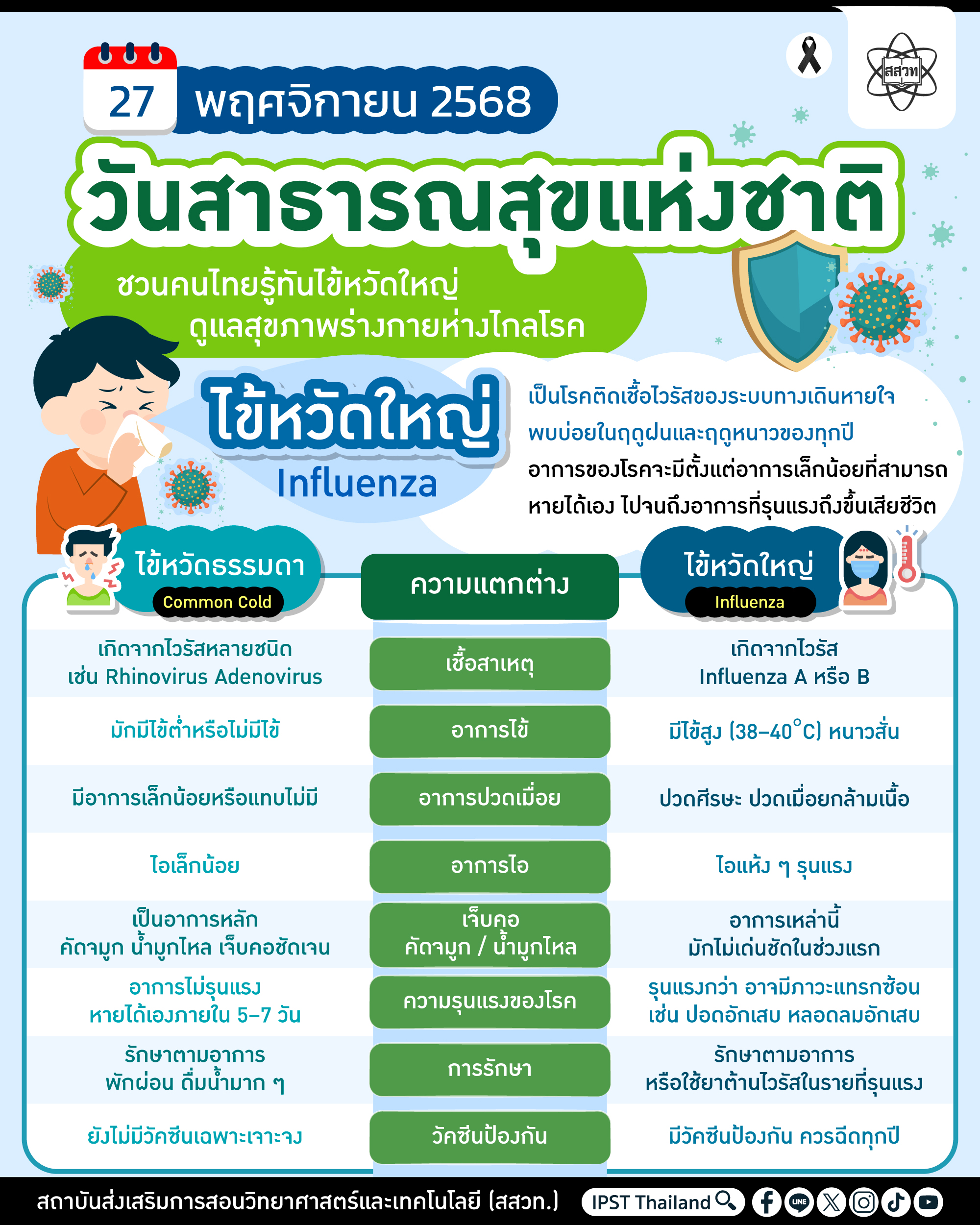 ในทุกวันที่ 27 พฤศจิกายน ซึ่งเป็นวันสาธารณสุขแห่งชาติ เราระลึกถึงจุดเริ่มต้นที่ทำให้คนไทยมีหลักประกันด้านสุขภาพ ทั้งการป้องกัน เฝ้าระวัง และดูแลรักษาโรค เมื่อฤดูกาลเปลี่ยนผ่านสู่ปลายฝนต้นหนาว โรคที่มักกลับมาพร้อมกับอากาศเย็นคือ “ไข้หวัดใหญ่” โรคติดเชื้อทางเดินหายใจที่ดูเหมือนธรรมดา แต่ความจริงอาจรุนแรงกว่าที่คิด โดยเฉพาะในเด็กเล็ก ผู้สูงอายุ หญิงตั้งครรภ์ ผู้ที่มีโรคประจำตัว หรือผู้ที่มีภูมิคุ้มกันอ่อนแอ