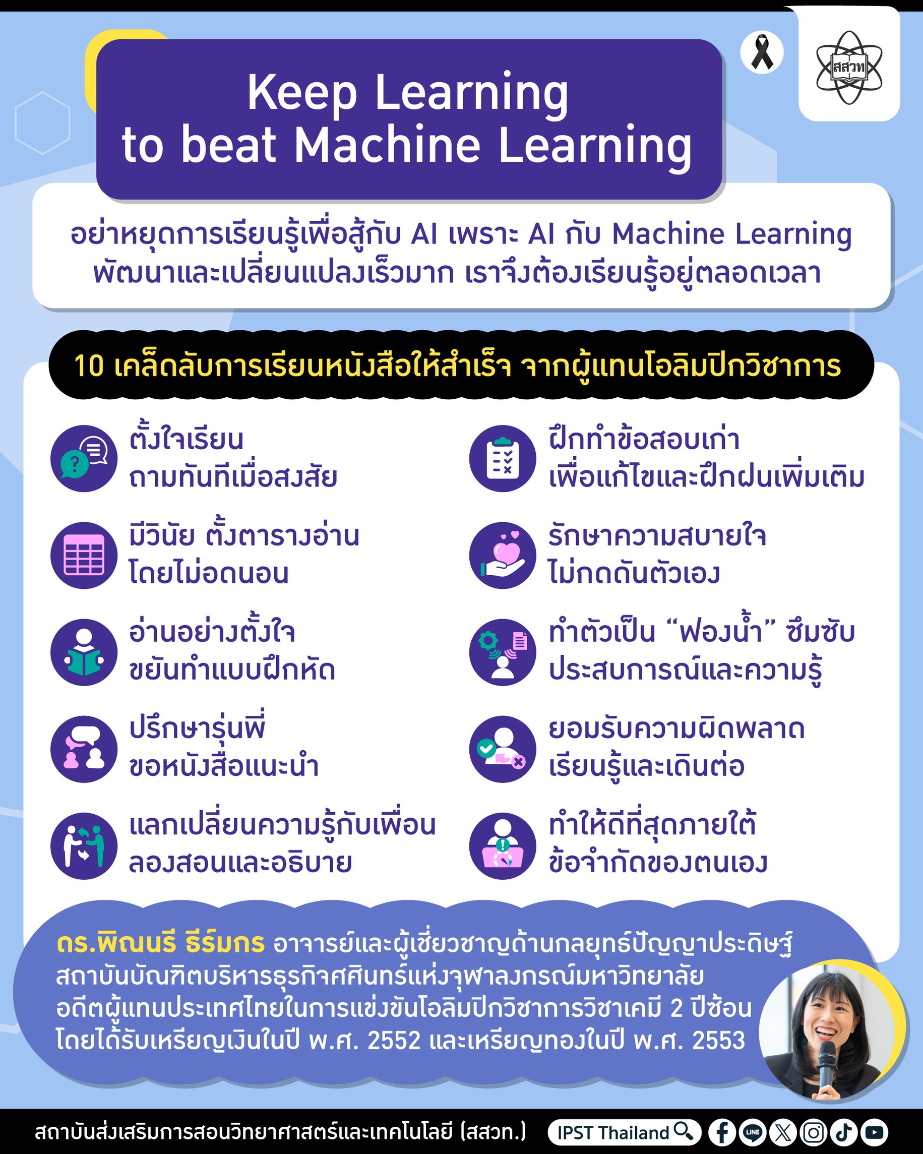 ย้อนกลับไปที่ “Keep Learning to beat Machine Learning” อย่าให้ “AI” ฉลาดกว่าใจที่ใฝ่เรียนรู้ หรือพูดง่าย ๆ ก็คืออย่าหยุดการเรียนรู้เพื่อสู้กับ AI นั่นเอง เพราะ AI กับ machine learning พัฒนาและเปลี่ยนแปลงเร็วมาก เราเลยต้องเรียนรู้ตลอดเวลา อ่านมาถึงตรงนี้แล้ว ไม่น่าแปลกใจเลยใช่ไหมที่อาจารย์เป็นผู้แทนประเทศไทยวิชาเคมีที่ทำคะแนนภาคทฤษฎีได้สูงที่สุด เราล่ะ ได้เรียนรู้อะไรที่จะเอาไปปรับใช้กับตัวเองได้บ้าง เริ่มต้น อ่านหนังสือเพิ่มกันวันละนิดละหน่อยดีไหม หากยังไม่รู้จะเลือกหนังสืออะไรอ่านดี ติดตามเฟซบุ๊ก IPST Thailand (https://www.facebook.com/ipst.thai) ที่มีเนื้อหาวิทยาศาสตร์ง่าย ๆ บางเรื่องอาจทำให้เราได้ค้นพบตัวเองก็เป็นได้นะ