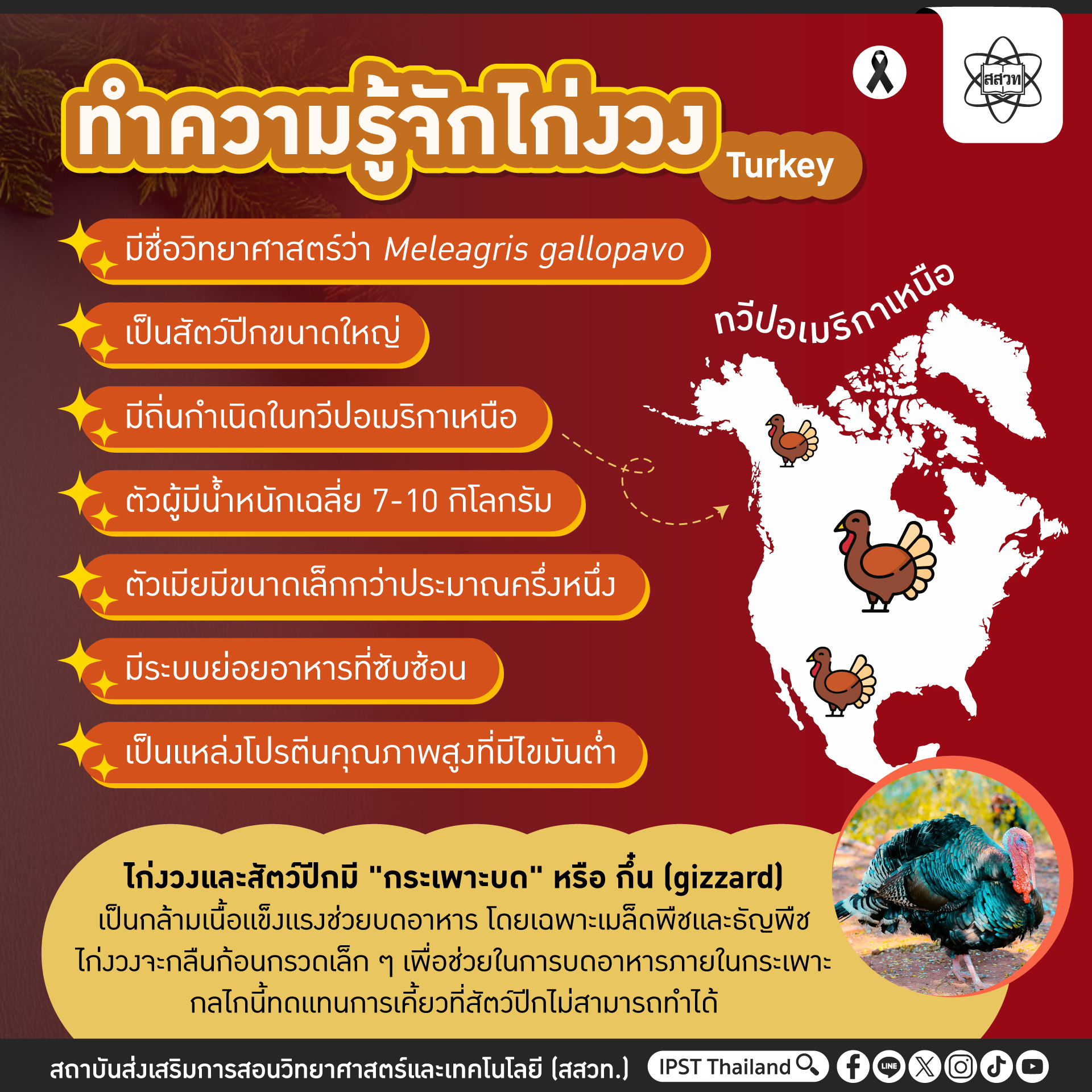 ไก่งวง (Turkey) มีชื่อวิทยาศาสตร์ว่า Meleagris gallopavo เป็นสัตว์ปีกขนาดใหญ่ที่มีถิ่นกำเนิดในทวีปอเมริกาเหนือ สำหรับในประเทศไทยไม่ปรากฎว่ามีการนำเข้ามาในประเทศเมื่อใด แต่ในปี พ.ศ. 2497 หลวงสุวรรณวาจกกสิกิจ ได้เขียนบทความส่งเสริมและแนะนำให้คนไทยเลี้ยงไก่งวง ซึ่งในปัจจุบันมีการเลี้ยงไก่งวงอย่างแพร่หลาย ไก่งวงตัวผู้มีน้ำหนักเฉลี่ยประมาณ 7-10 กิโลกรัม ส่วนตัวเมียมีขนาดเล็กกว่าประมาณครึ่งหนึ่ง ความน่าสนใจคือไก่งวงและสัตว์ปีกนั้นมีระบบย่อยอาหารที่ซับซ้อน โดยมี “กระเพาะบด” หรือ กึ๋น หรือ gizzard ที่เป็นกล้ามเนื้อแข็งแรงช่วยบดอาหาร โดยเฉพาะเมล็ดพืชและเมล็ดธัญพืช ไก่งวงจะกลืนก้อนกรวดเล็กๆ เพื่อช่วยในการบดอาหารภายในกระเพาะ กลไกนี้ทดแทนการเคี้ยวที่สัตว์ปีกไม่สามารถทำได้ สำหรับคุณค่าทางอาหาร พบว่าเนื้อไก่งวงเป็นแหล่งโปรตีนคุณภาพสูงที่มีไขมันต่ำ โดยเฉพาะเนื้อส่วนอก 3 ออนซ์ (ประมาณ 85 กรัม) ของเนื้อไก่งวง ให้โปรตีนประมาณ 26 กรัม แต่มีไขมันเพียง 2 กรัม นอกจากนี้ยังมีสารอาหารอื่น เช่น วิตามินบี โดยเฉพาะ B3 (niacin) และ B6 แร่ธาตุเช่น ฟอสฟอรัส โพแทสเซียม โซเดียม