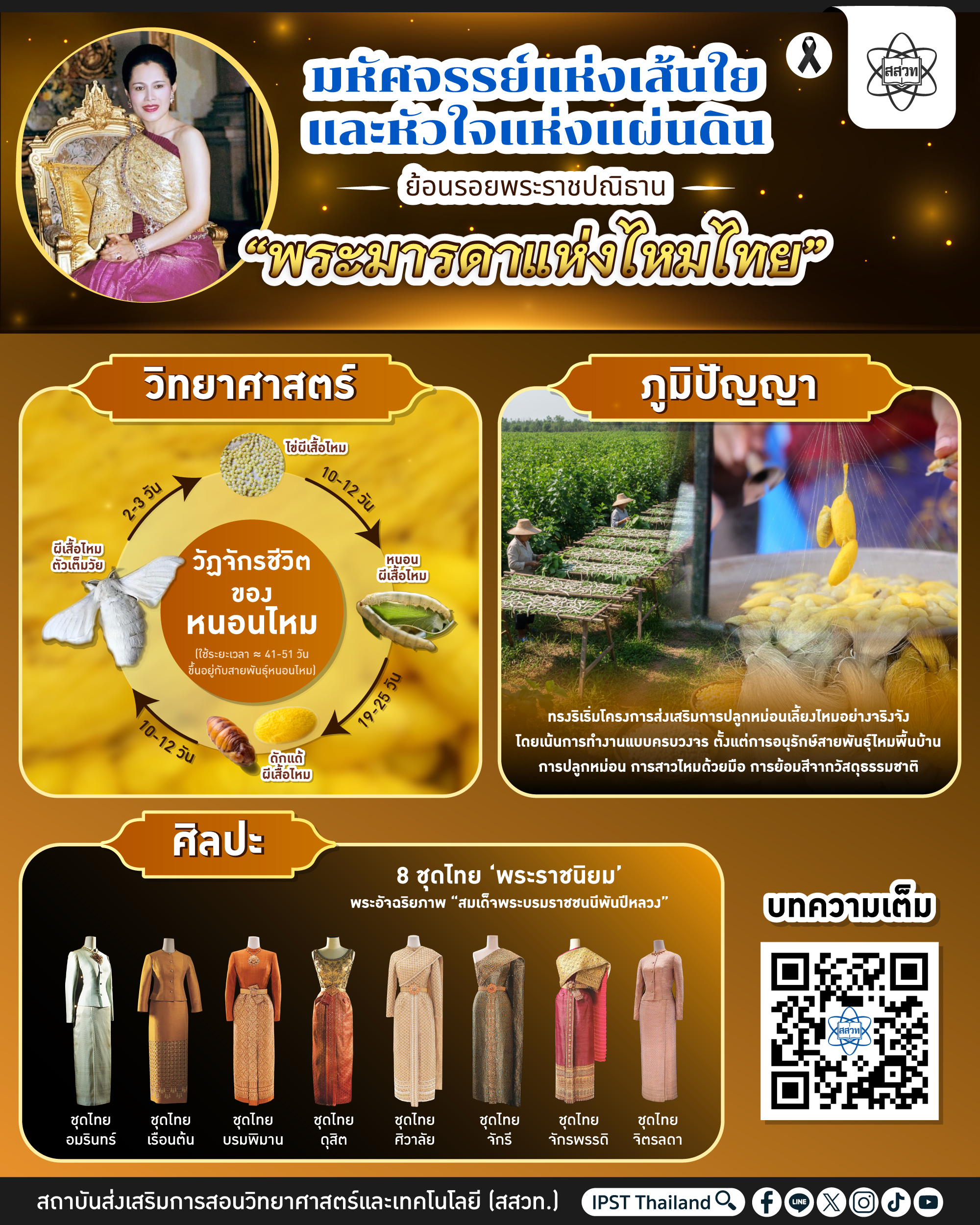 พระราชกรณียกิจด้านผ้าไหมและชุดไทยของสมเด็จพระนางเจ้าสิริกิติ์ พระบรมราชินีนาถ พระบรมราชชนนีพันปีหลวง คือการหลอมรวมวิทยาศาสตร์ที่เข้าใจถึงชีววิทยาของเส้นใยไหม เข้ากับภูมิปัญญาท้องถิ่นที่สืบทอดมานับพันปี และศิลปะการออกแบบชั้นสูง จนเกิดเป็นมรดกวัฒนธรรมที่จับต้องได้ พระราชปณิธานของพระองค์ไม่เพียงช่วยให้พสกนิกรมีรายได้และคุณภาพชีวิตที่ดีขึ้น แต่ยังทำให้ผ้าไหมไทยกลายเป็นเครื่องหมายแห่งความภาคภูมิใจในระดับสากล ผืนผ้าไหมทุกผืนจึงเปรียบเสมือนจดหมายเหตุแห่งพระมหากรุณาธิคุณ ที่เชื่อมร้อยหัวใจคนไทยทุกภูมิภาคเข้าด้วยกัน และเป็นสะพานที่นำความงามของเอกลักษณ์ไทยสู่สายตาของชาวโลกอย่างยั่งยืน