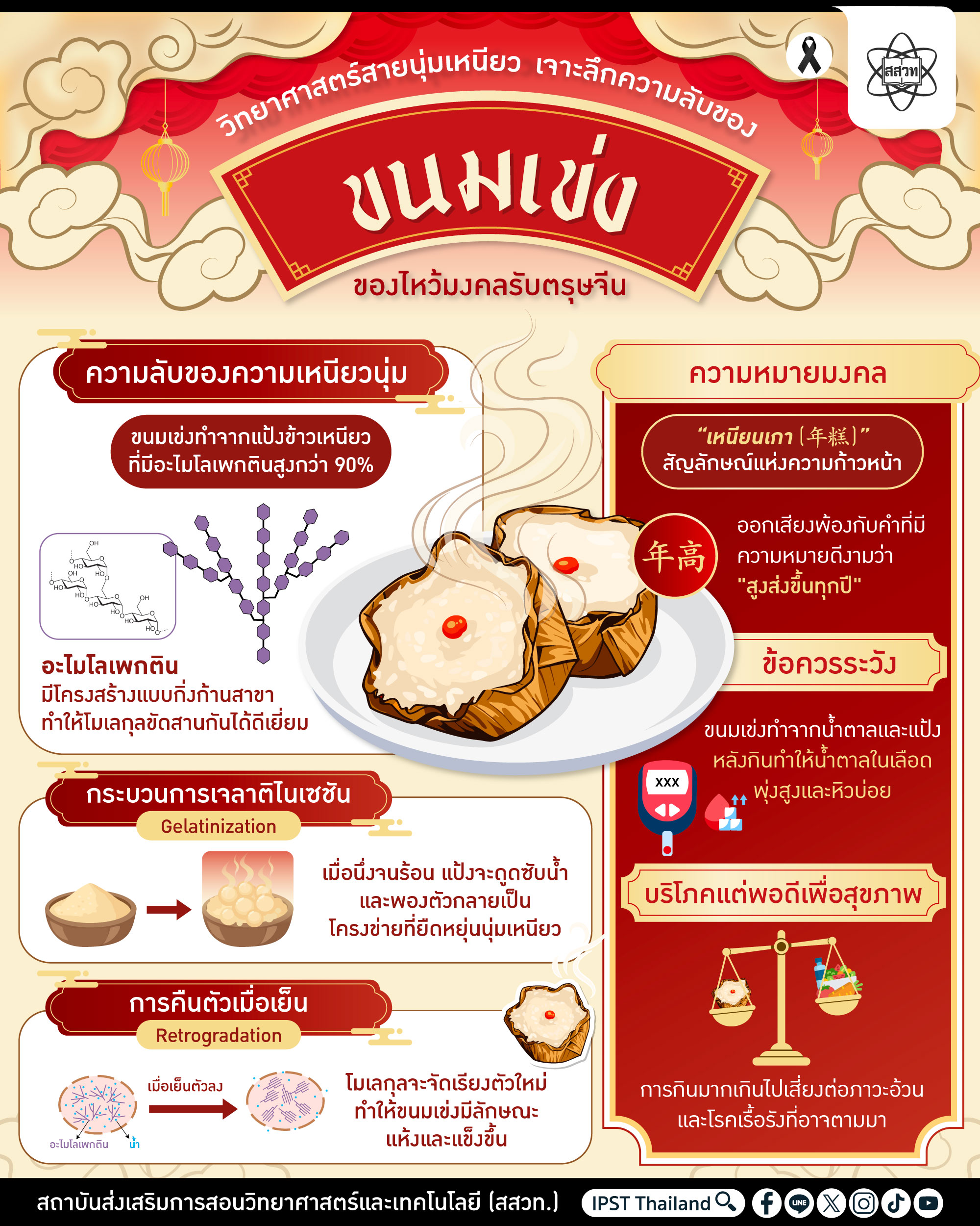 ตรุษจีนปี 2569 นี้ ขอให้แฟนเพจ IPST Thailand ทุกท่านมีความรักที่ “เหนียวแน่น” เหมือนโครงข่ายอะไมโลเพกติน และหน้าที่การงาน “สูงส่ง” ก้าวหน้าเหมือนชื่อขนมเข่งนะคะ!