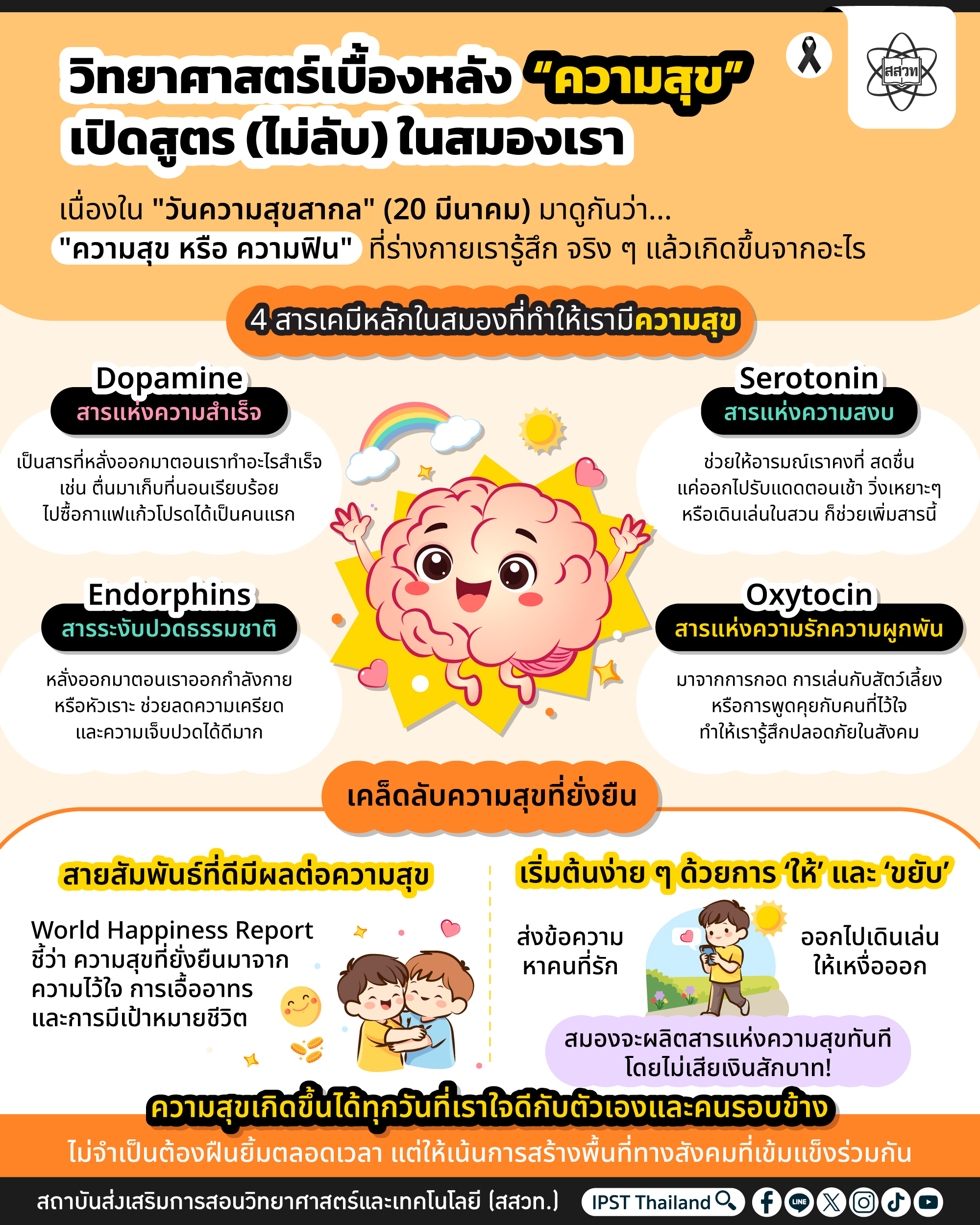 ท้ายนี้ ความสุขอาจไม่ใช่จุดหมายปลายทางที่ยิ่งใหญ่ แต่มันคือปฏิกิริยาเคมีเล็กๆ ที่เกิดขึ้นทุกวันที่เราใจดีกับตัวเองและคนรอบข้าง… สุขสันต์วันความสุขสากลนะคะ!