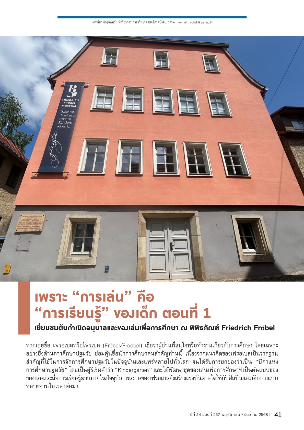 เพราะ “การเล่น” คือ “การเรียนรู้” ของเด็ก ตอนที่ 1 24 เมษายน 2569 แก้ไขล่าสุดเมื่อ: (แก้ไข 24 เมษายน 2026)จำนวนการเข้าชม 12 ครั้ง 12 โดย แคทลียา จักขุจันทร์ (นักวิชาการ สาขาวิทยาศาสตร์ภาคบังคับ) อ่านต่อได้ที่นิตยสาร สสวท. ปีที่ 54 ฉบับที่ 257 พฤศจิกายน – ธันวาคม 2568 หน้า 41-47 FacebookFacebookXTwitterLINELine ป้ายกำกับ:Friedrich FroebelKindergartenการศึกษาปฐมวัยการเล่นคือการเรียนรู้ของเล่นเพื่อการศึกษา