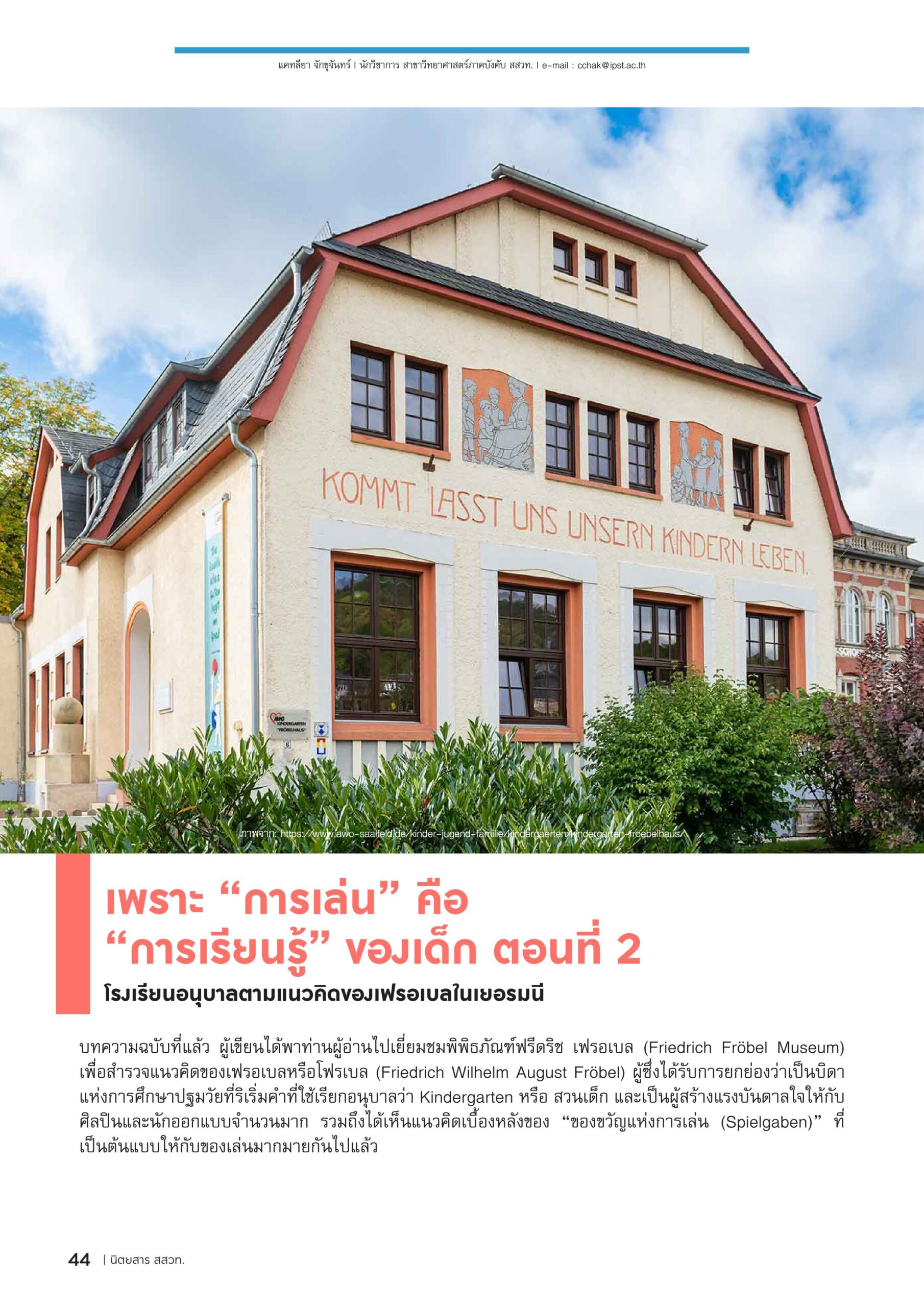 เพราะ “การเล่น” คือ “การเรียนรู้” ของเด็ก ตอนที่ 2 25 เมษายน 2569 แก้ไขล่าสุดเมื่อ: (แก้ไข 25 เมษายน 2026)จำนวนการเข้าชม 6,551,388 ครั้ง 6,551,388 โดย แคทลียา จักขุจันทร์ (นักวิชาการ สาขาวิทยาศาสตร์ภาคบังคับ) อ่านต่อได้ที่นิตยสาร สสวท. ปีที่ 54 ฉบับที่ 258 มกราคม – กุมภาพันธ์ 2569 หน้า 44-49 FacebookFacebookXTwitterLINELine ป้ายกำกับ:KindergartenPlay-based Learningการเล่นคือการเรียนรู้พัฒนาการเด็กปฐมวัยโรงเรียนอนุบาล