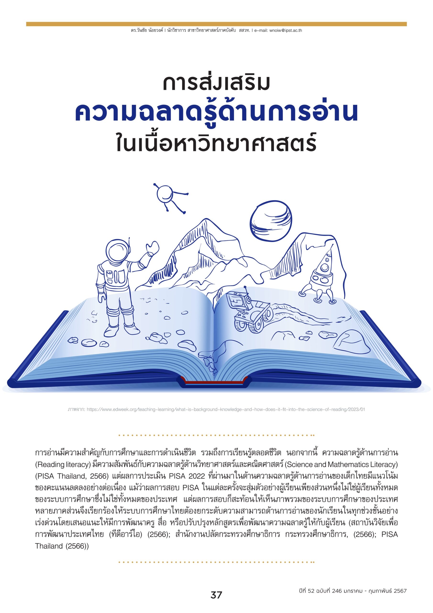 การส่งเสริมความฉลาดรู้ด้านการอ่านในเนื้อหาวิทยาศาสตร์ 29 เมษายน 2569 แก้ไขล่าสุดเมื่อ: (แก้ไข 29 เมษายน 2026)จำนวนการเข้าชม 6,558,897 ครั้ง 6,558,897 โดย ดร.วันชัย น้อยวงศ์ (นักวิชาการอาวุโส สาขาวิทยาศาสตร์ภาคบังคับ) อ่านต่อได้ที่ นิตยสาร สสวท. ปีที่ 52 ฉบับที่ 246 มกราคม – กุมภาพันธ์ 2567 หน้า 37-43 FacebookFacebookXTwitterLINELine ป้ายกำกับ:PISAการสอนวิทยาศาสตร์ความฉลาดรู้ด้านการอ่านวิทยาศาสตร์