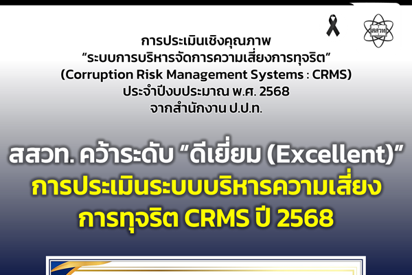 สสวท. คว้าระดับ “ดีเยี่ยม (Excellent)” การประเมินระบบบริหารความเสี่ยงการทุจริต CRMS ปี 2568 24 มีนาคม 2569 แก้ไขล่าสุดเมื่อ: (แก้ไข 24 มีนาคม 2026)