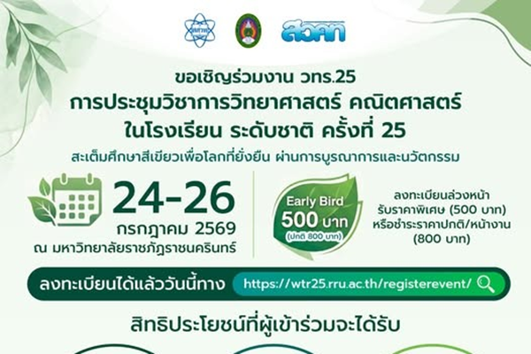 สสวท. ชวนครูทั่วประเทศร่วมขับเคลื่อนห้องเรียนอนาคต! “วทร.25” เปิดรับผลงานวิชาการ สะเต็มศึกษาสีเขียวเพื่อโลกที่ยั่งยืน ถึง 30 มีนาคม นี้ 24 มีนาคม 2569 แก้ไขล่าสุดเมื่อ: (แก้ไข 24 มีนาคม 2026)