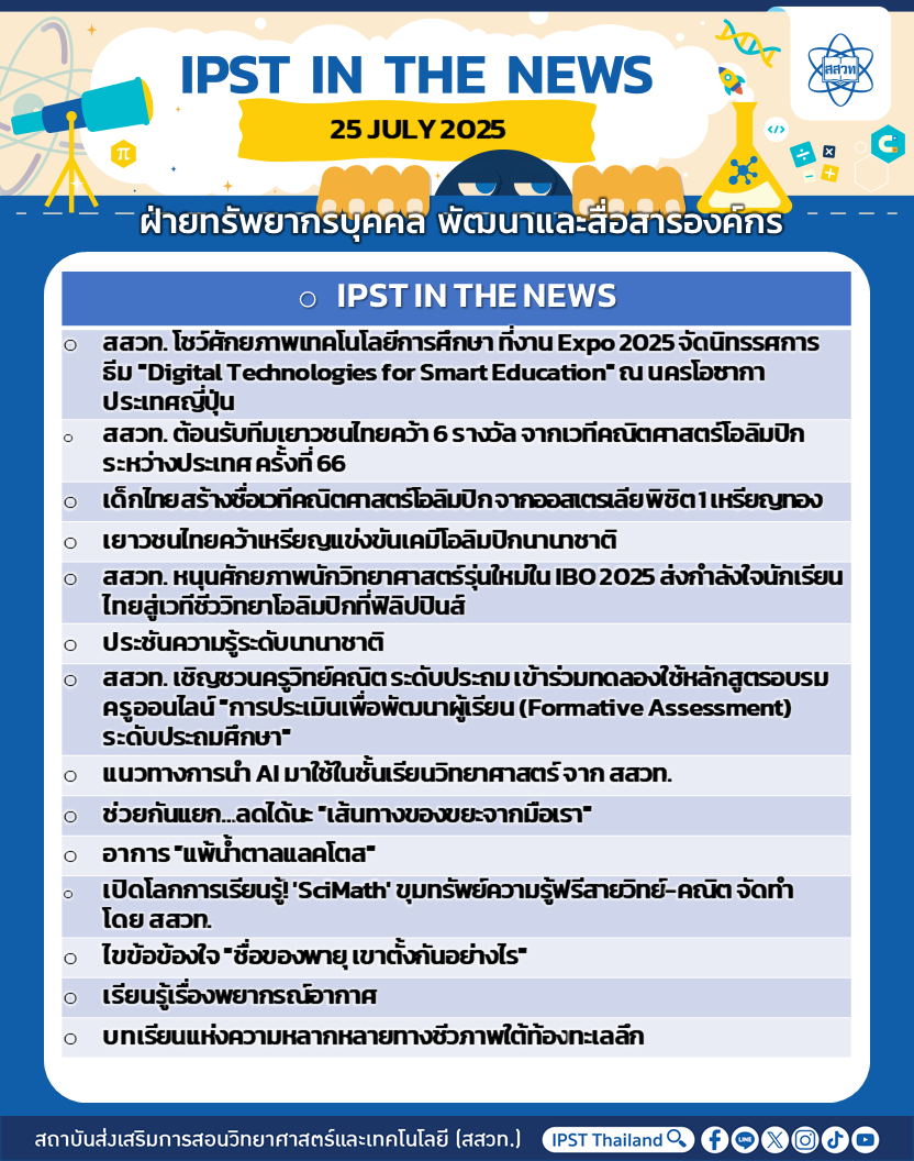 สถาบันส่งเสริมการสอนวิทยาศาสตร์และเทคโนโลยี (สสวท.) ได้ดำเนินงานตามภารกิจอย่างต่อเนื่อง รวมถึงได้ประชาสัมพันธ์ข่าวสารเพื่อให้ครู นักเรียน ผู้ปกครอง และประชาชนทั่วไป ได้รับทราบ เข้าถึงสื่อ ผลงาน กิจกรรม และข่าวต่าง ๆ สสวท. ขอประชาสัมพันธ์ข่าวประจำสัปดาห์ (IPST IN THE NEWS) ระหว่างวันที่ 21-22 กรกฎาคม 2568 รายละเอียดดังนี้