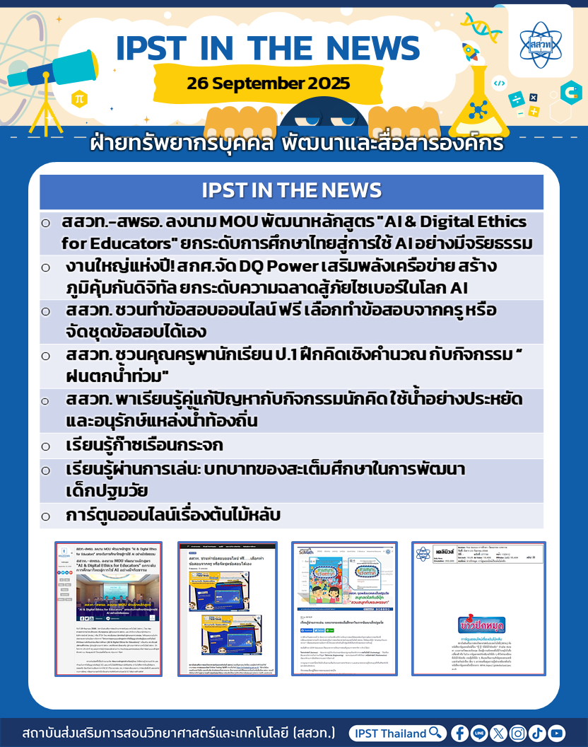 สถาบันส่งเสริมการสอนวิทยาศาสตร์และเทคโนโลยี (สสวท.) ได้ดำเนินงานตามภารกิจอย่างต่อเนื่อง รวมถึงได้ประชาสัมพันธ์ข่าวสารเพื่อให้ครู นักเรียน ผู้ปกครอง และประชาชนทั่วไป ได้รับทราบ เข้าถึงสื่อ ผลงาน กิจกรรม และข่าวต่าง ๆ สสวท. ขอประชาสัมพันธ์ข่าวประจำสัปดาห์ (IPST IN THE NEWS) ระหว่างวันที่ 22-26 กันยายน 2568 รายละเอียดดังนี้