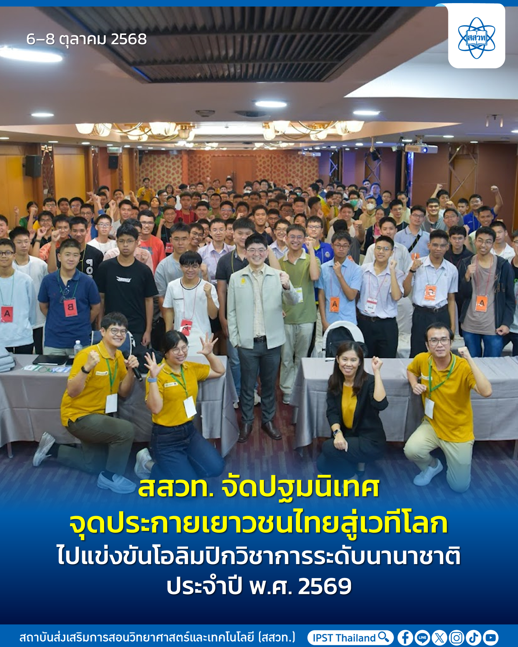 สถาบันส่งเสริมการสอนวิทยาศาสตร์และเทคโนโลยี (สสวท.) จัดปฐมนิเทศการอบรมคัดเลือก ครั้งที่ 1 โครงการจัดส่งผู้แทนประเทศไทยไปแข่งขันคณิตศาสตร์ วิทยาศาสตร์โอลิมปิกระหว่างประเทศ ประจำปี พ.ศ. 2569 ระหว่างวันที่ 6–8 ตุลาคม 2568 ณ โรงแรมแกรนด์ ทาวน์เวอร์อินน์ กรุงเทพฯ โดยมี รองศาสตราจารย์ ดร.ธีระเดช เจียรสุขสกุล ผู้อำนวยการ สสวท. เป็นประธานเปิดการอบรม พร้อมกล่าวให้โอวาทและแนะแนวทางการพัฒนาเยาวชนไทยให้มีศักยภาพด้านวิทยาศาสตร์และเทคโนโลยีอย่างรอบด้าน พร้อมด้วย นางสาวรัชดา ยาตรา ผู้อำนวยการฝ่ายโอลิมปิกวิชาการและอัจฉริยภาพ เจ้าหน้าที่ สสวท. และนักเรียนที่ผ่านการคัดเลือกจากทั่วประเทศเข้าร่วมกิจกรรมการปฐมนเทศ กว่า 120 คน ที่ประกอบด้วยนักเรียนวิชาคณิตศาสตร์ คอมพิวเตอร์ เคมี และฟิสิกส์ เพื่อเตรียมความพร้อมด้านความรู้ ทักษะ และทัศนคติที่จำเป็นต่อการเป็นตัวแทนประเทศไทยในเวทีระดับนานาชาติ รวมถึงชี้แจงรายละเอียการอบรมคัดเลือก ครั้งที่ 1 และการประชาสัมพันธ์ทุนโอลิมปิกวิชาการฯ ในครั้งนี้ด้วย