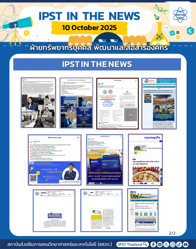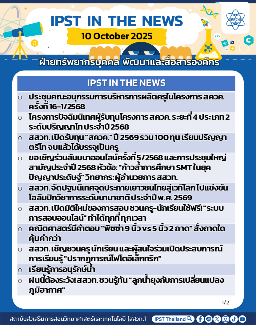 สถาบันส่งเสริมการสอนวิทยาศาสตร์และเทคโนโลยี (สสวท.) ได้ดำเนินงานตามภารกิจอย่างต่อเนื่อง รวมถึงได้ประชาสัมพันธ์ข่าวสารเพื่อให้ครู นักเรียน ผู้ปกครอง และประชาชนทั่วไป ได้รับทราบ เข้าถึงสื่อ ผลงาน กิจกรรม และข่าวต่าง ๆ สสวท. ขอประชาสัมพันธ์ข่าวประจำสัปดาห์ (IPST IN THE NEWS) ระหว่างวันที่ 6-10 ตุลาคม 2568 รายละเอียดดังนี้