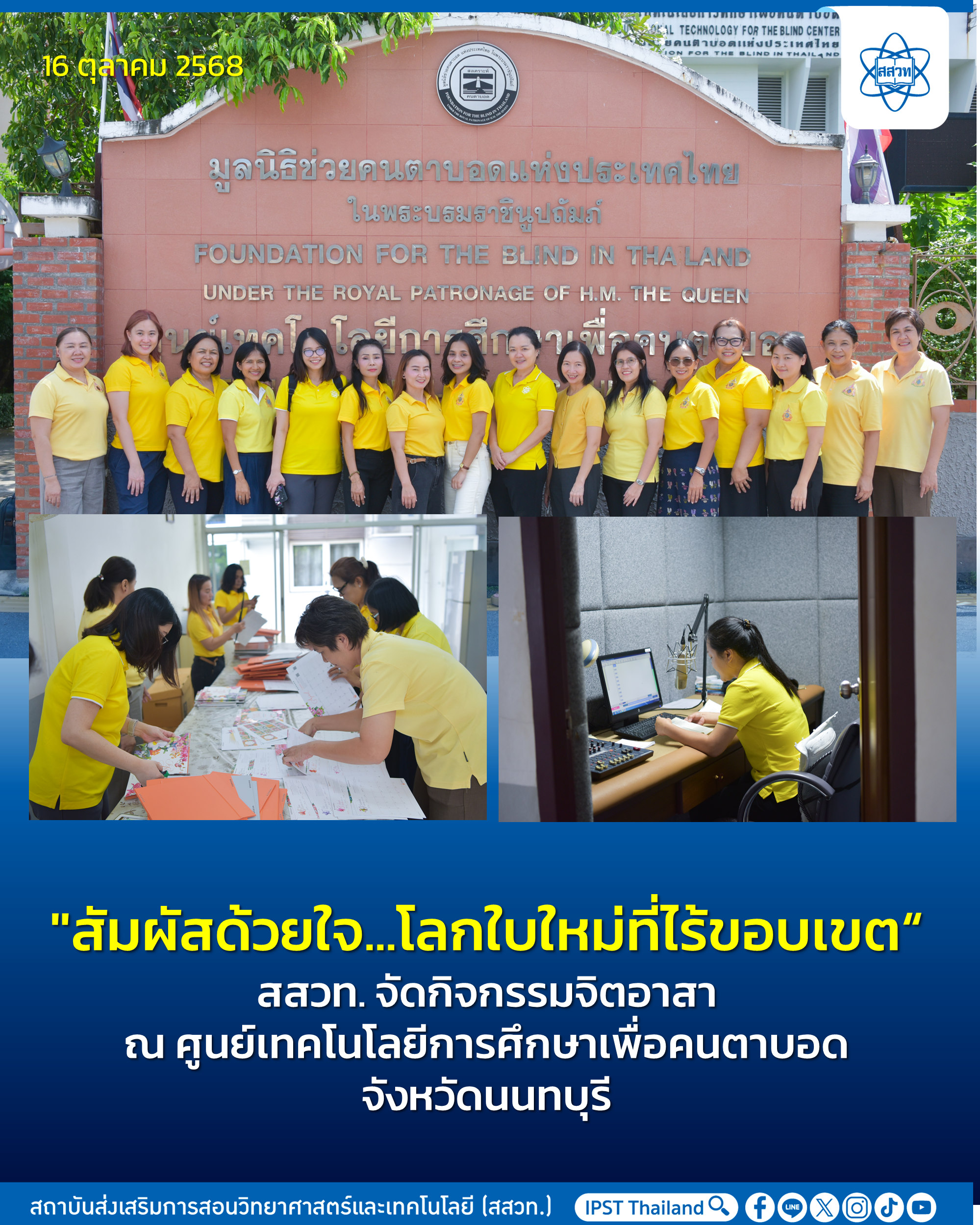 สถาบันส่งเสริมการสอนวิทยาศาสตร์และเทคโนโลยี (สสวท.) จัดกิจกรรมจิตอาสาสมัครอ่านหนังสือบันทึกเสียงให้คนตาบอด “สัมผัสด้วยใจ…โลกใบใหม่ที่ไร้ขอบเขต” กิจกรรมประกอบด้วย อ่านบันทึกหนังสือเสียง คัดแยกปฏิทินเตรียมผลิตหนังสืออักษรเบรลล์ เมื่อวันที่ 16 ตุลาคม 2568 ณ ศูนย์เทคโนโลยีเพื่อคนตาบอด ตำบลบางตลาด อำเภอปากเกร็ด จังหวัดนนทบุรี
