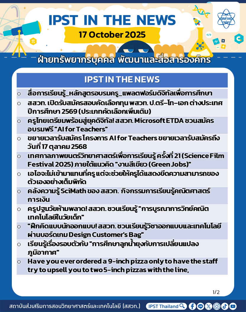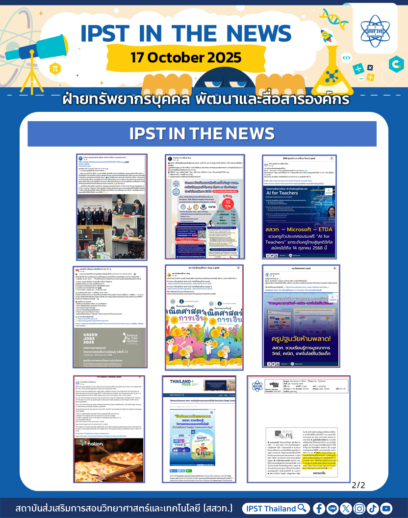 สถาบันส่งเสริมการสอนวิทยาศาสตร์และเทคโนโลยี (สสวท.) ได้ดำเนินงานตามภารกิจอย่างต่อเนื่อง รวมถึงได้ประชาสัมพันธ์ข่าวสารเพื่อให้ครู นักเรียน ผู้ปกครอง และประชาชนทั่วไป ได้รับทราบ เข้าถึงสื่อ ผลงาน กิจกรรม และข่าวต่าง ๆ สสวท. ขอประชาสัมพันธ์ข่าวประจำสัปดาห์ (IPST IN THE NEWS) ระหว่างวันที่ 14-17 ตุลาคม 2568 รายละเอียดดังนี้