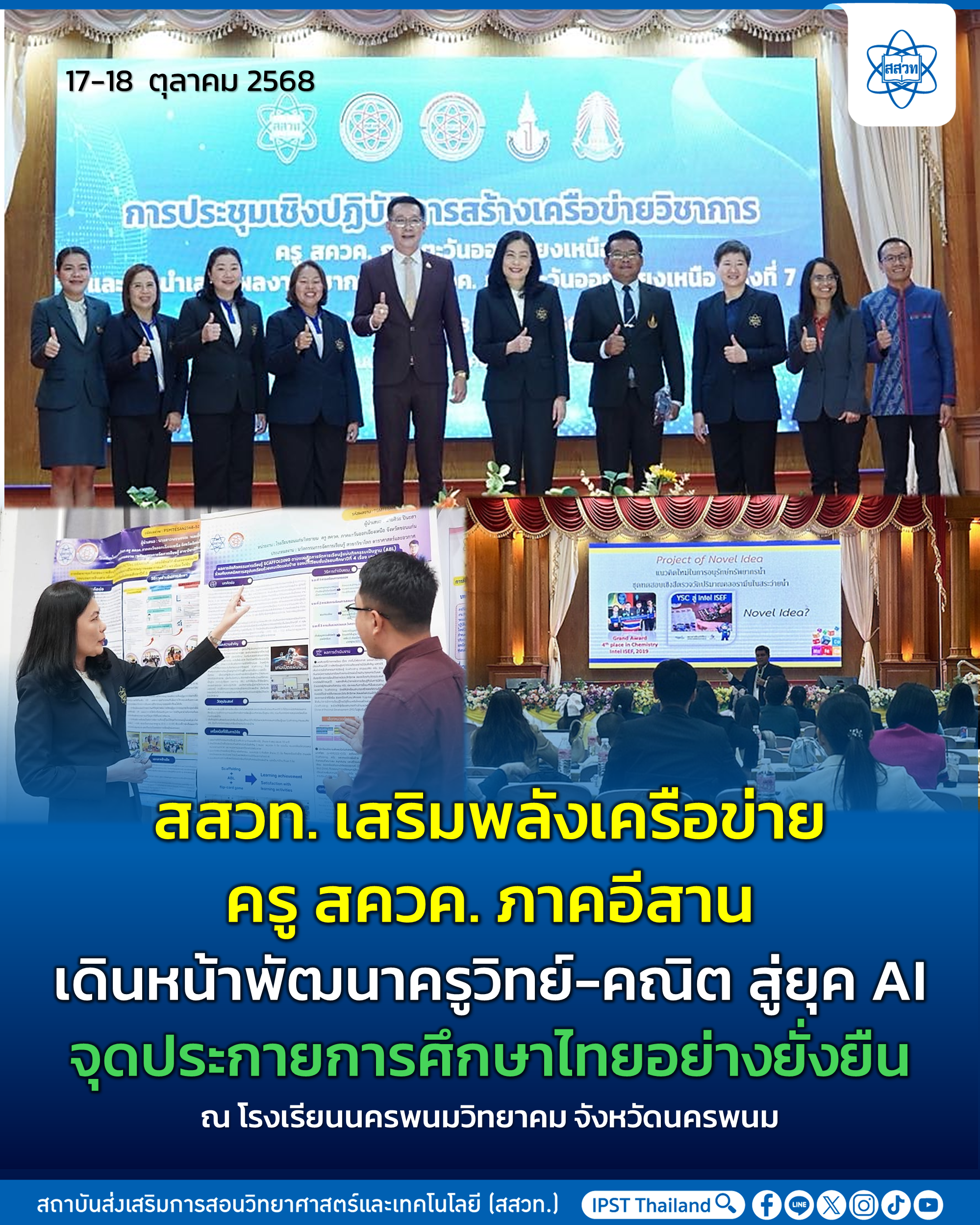 ดร.สุพรรณี ชาญประเสริฐ ผู้ช่วยผู้อำนวยการสถาบันส่งเสริมการสอนวิทยาศาสตร์และเทคโนโลยี (สสวท.) เข้าร่วมการประชุมเครือข่ายวิชาการครู สควค. ภาคตะวันออกเฉียงเหนือ และการประชุมวิชาการนำเสนอผลงานครู สควค. ภาคตะวันออกเฉียงเหนือ ครั้งที่ 7 ระหว่างวันที่ 17 – 18 ตุลาคม 2568 ณ โรงเรียนนครพนมวิทยาคม จังหวัดนครพนม พร้อมบรรยายถึงแนวทางการพัฒนาครู สควค. ผ่านการขับเคลื่อนร่วมกับศูนย์เครือข่ายวิชาการครู สควค. ในภูมิภาค เพื่อเสริมสร้างศักยภาพครูและยกระดับคุณภาพการเรียนการสอนวิทยาศาสตร์ คณิตศาสตร์ และเทคโนโลยีให้สอดคล้องกับการเปลี่ยนแปลงของโลกยุคใหม่ โดยการประชุมในครั้งนี้ยังได้รับเกียรติจาก นายภูวนารถ ตั้งศิริ ผู้อำนวยการโรงเรียนนครพนมวิทยาคม เป็นประธานในพิธีเปิดงานประชุมอีกด้วย