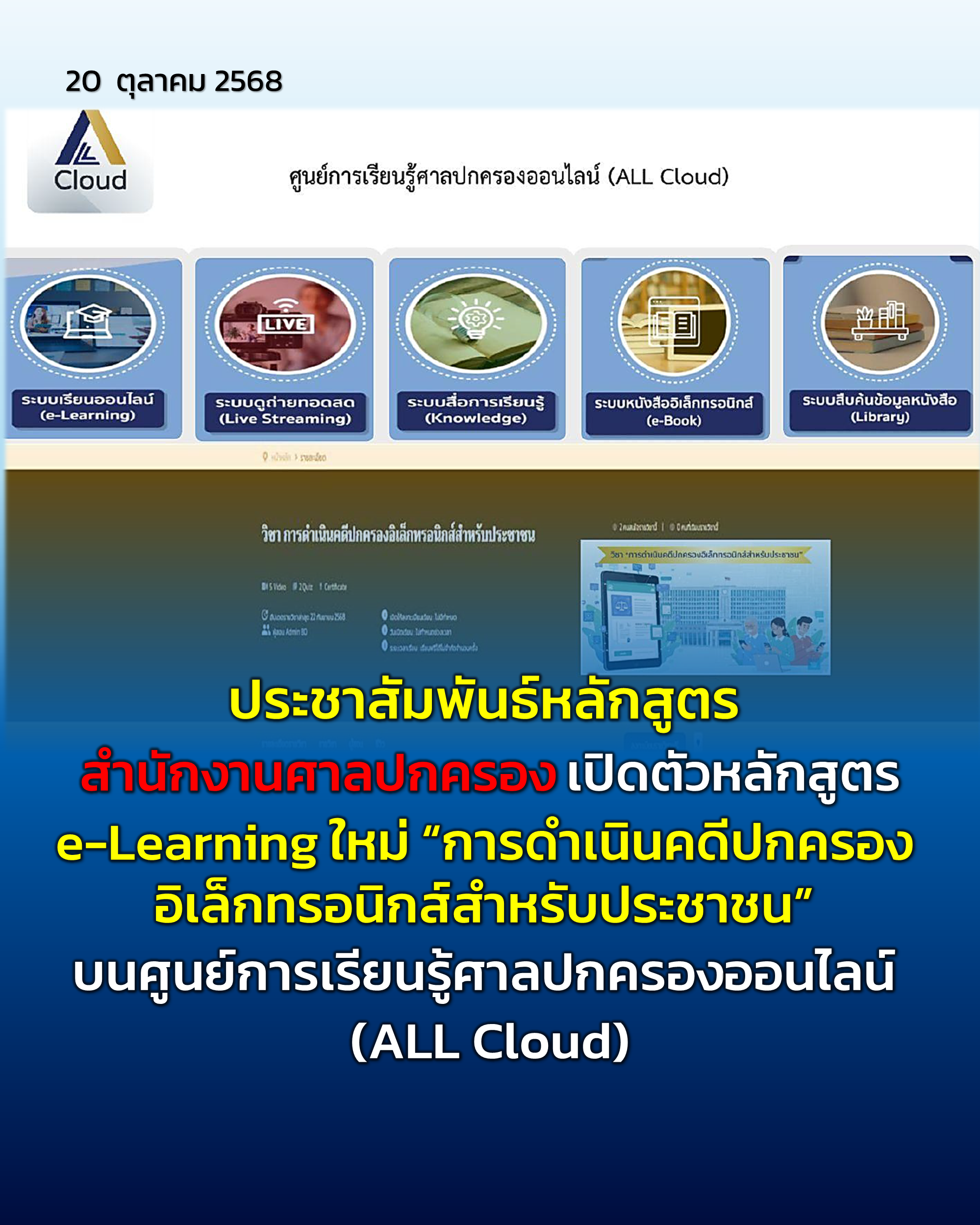 สำนักงานศาลปกครองขอเชิญชวนบุคลากรและประชาชนทั่วไปเข้าร่วมเรียนรู้หลักสูตร e-Learning หัวข้อวิชา “การดำเนินคดีปกครองอิเล็กทรอนิกส์สำหรับประชาชน” ซึ่งเป็นรายวิชาใหม่ที่เผยแพร่บนศูนย์การเรียนรู้ศาลปกครองออนไลน์ (ALL Cloud)