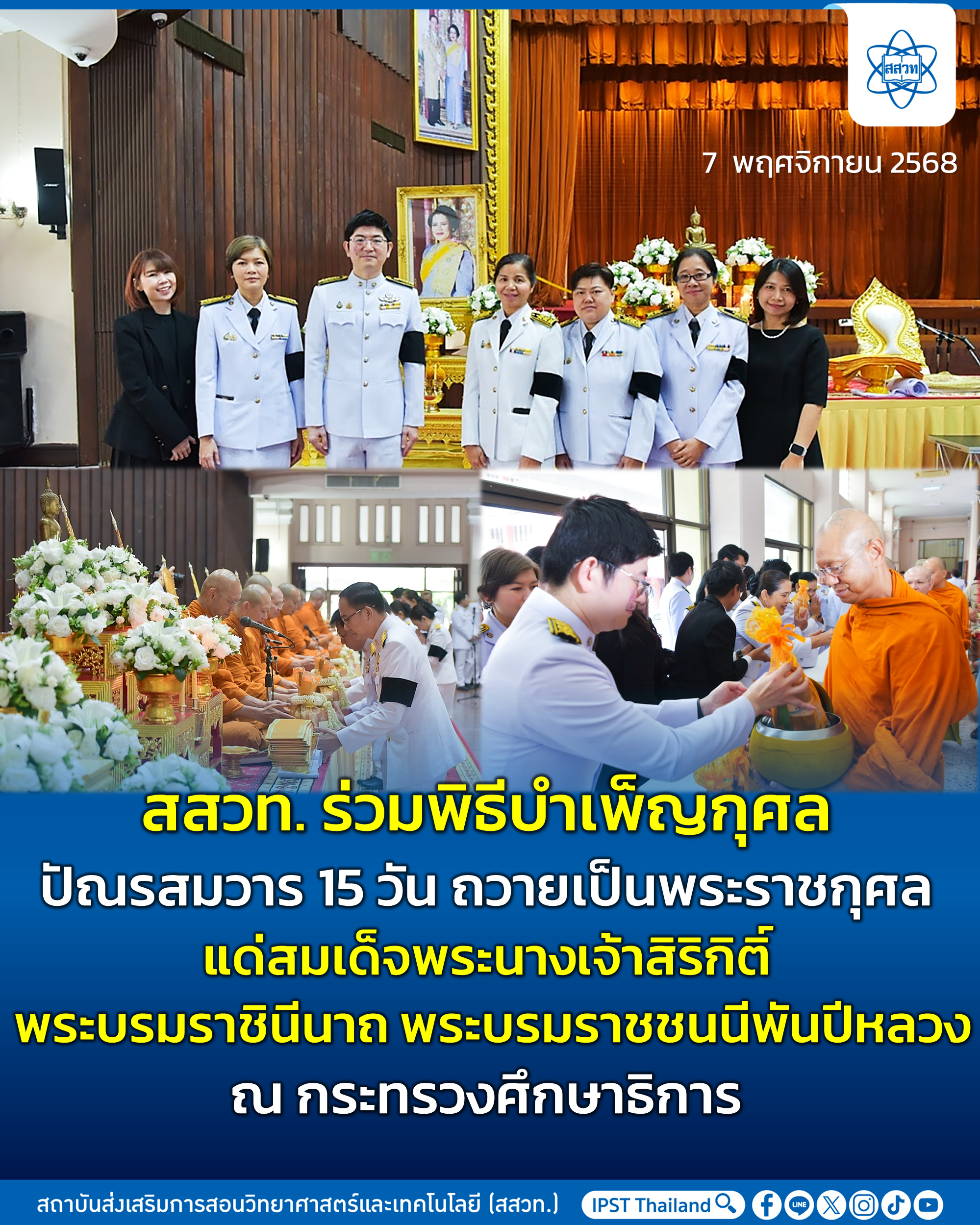 รองศาสตราจารย์ ดร.ธีระเดช เจียรสุขสกุล ผู้อำนวยการสถาบันส่งเสริมการสอนวิทยาศาสตร์และเทคโนโลยี (สสวท.) นำคณะผู้บริหาร และพนักงาน เข้าร่วมในพิธีบำเพ็ญพระราชกุศลปัณรสมวาร 15 วัน จัดขึ้นเพื่ออุทิศถวายแด่ สมเด็จพระนางเจ้าสิริกิติ์ พระบรมราชินีนาถ พระบรมราชชนนีพันปีหลวง ในวาระครบ 15 วัน แห่งการสวรรคต นับตั้งแต่วันที่ 24 ตุลาคม 2568 เป็นต้นมา โดยมี รศ.ดร.ประวิต เอราวรรณ์ เลขาธิการสภาการศึกษา ซึ่งได้รับมอบหมายจากรัฐมนตรีว่าการกระทรวงศึกษาธิการให้เป็นประธานในพิธี พร้อมด้วยคณะผู้บริหารระดับสูง ตลอดจนข้าราชการกระทรวงศึกษาธิการ เข้าร่วมในพิธี เมื่อวันที่ 7 พฤศจิกายน 2568 ณ หอประชุมคุรุสภา กระทรวงศึกษาธิการ