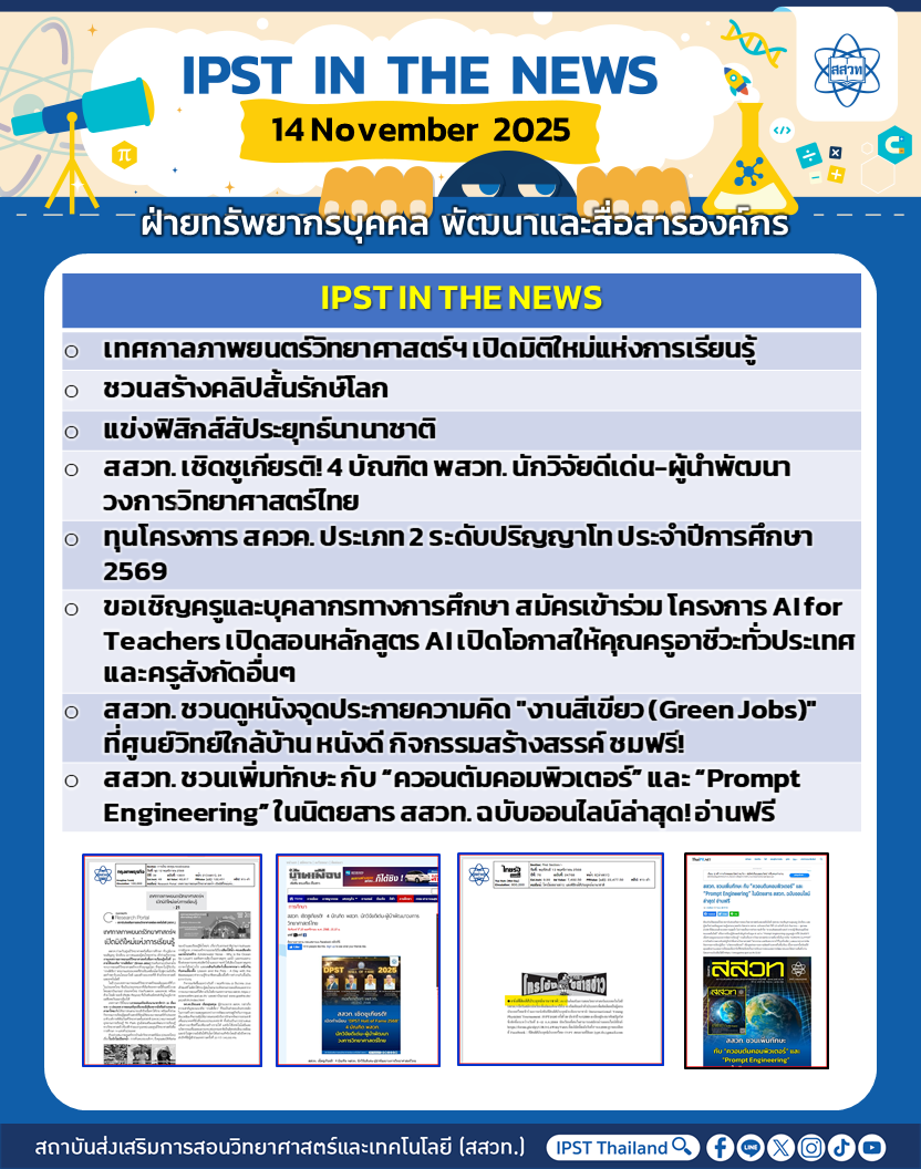 สถาบันส่งเสริมการสอนวิทยาศาสตร์และเทคโนโลยี (สสวท.) ได้ดำเนินงานตามภารกิจอย่างต่อเนื่อง รวมถึงได้ประชาสัมพันธ์ข่าวสารเพื่อให้ครู นักเรียน ผู้ปกครอง และประชาชนทั่วไป ได้รับทราบ เข้าถึงสื่อ ผลงาน กิจกรรม และข่าวต่าง ๆ สสวท. ขอประชาสัมพันธ์ข่าวประจำสัปดาห์ (IPST IN THE NEWS) ระหว่างวันที่ 10-14 พฤศจิกายน 2568 รายละเอียดดังนี้