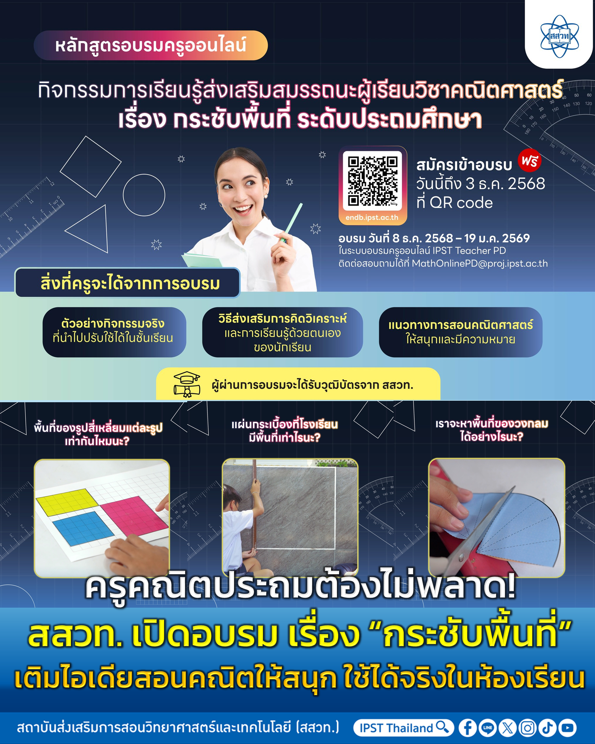 สถาบันส่งเสริมการสอนวิทยาศาสตร์และเทคโนโลยี (สสวท.) โดยสาขาคณิตศาสตร์ประถมศึกษา เชิญชวนครูคณิตศาสตร์ประถมศึกษาทั่วประเทศสมัครอบรมออนไลน์ (rerun) หลักสูตร “กิจกรรมการเรียนรู้ที่ส่งเสริมสมรรถนะผู้เรียน วิชาคณิตศาสตร์ เรื่อง กระชับพื้นที่ ระดับประถมศึกษา” ที่ออกแบบมาเพื่อช่วยคุณครูยกระดับการจัดการเรียนรู้ที่เน้นการส่งเสริมสมรรถนะของผู้เรียนในด้านพื้นที่ของรูปเรขาคณิตอย่างสนุกและมีความหมาย พร้อมตัวอย่างกิจกรรมจริงที่นำไปใช้ได้ทันที ส่งเสริมการคิดวิเคราะห์และการเรียนรู้ด้วยตนเองของนักเรียน เหมาะอย่างยิ่งสำหรับครูประถมที่ต้องการเพิ่มพลังการสอนยุคใหม่ สนใจสมัครได้ที่ https://endb.ipst.ac.th/activity/detail/745 หรือแสกน QR Code ตั้งแต่วันนี้ถึงวันที่ 3 ธันวาคม 2568 อบรมฟรี! ได้ทุกที่ ทุกเวลา ผ่านระบบอบรมครูออนไลน์ สสวท. https://teacherpd.ipst.ac.th/ ระหว่างวันที่ 8 ธันวาคม 2568 – 19 มกราคม 2569 ผู้ผ่านการอบรมจะได้รับวุฒิบัตรจาก สสวท. ดูรายละเอียดเพิ่มเติมที่เพจสาขาวิชาคณิตศาสตร์ สสวท. https://www.facebook.com/math.ipst?locale=th_TH ติดต่อสอบถามที่อีเมล MathOnline@proj.ipst.ac.th