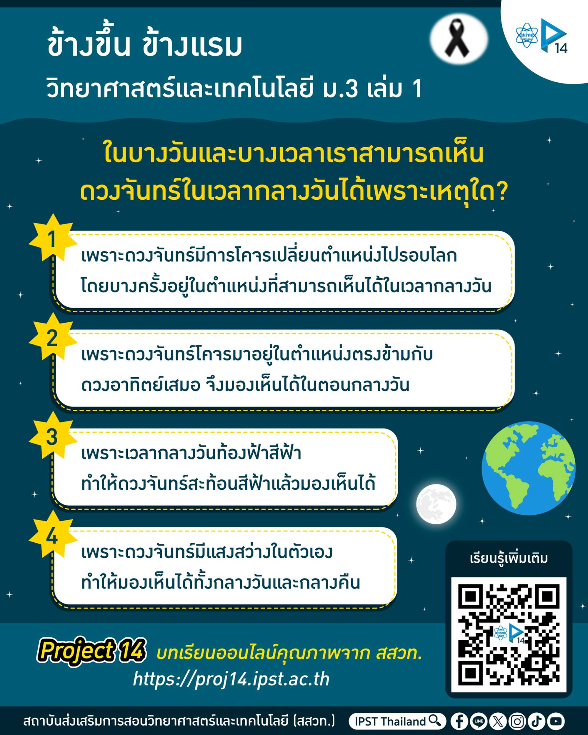 การเรียนรู้ดาราศาสตร์ผ่านบทเรียนออนไลน์ Project 14 ของ สสวท. เรื่อง “ข้างขึ้น ข้างแรม” (หนังสือรายวิชาพื้นฐานวิทยาศาสตร์และเทคโนโลยี ม.3 เล่ม 1) เพื่อไขคำตอบว่าเหตุใดบางวันเราจึงมองเห็นดวงจันทร์ได้แม้ในเวลากลางวัน พร้อม