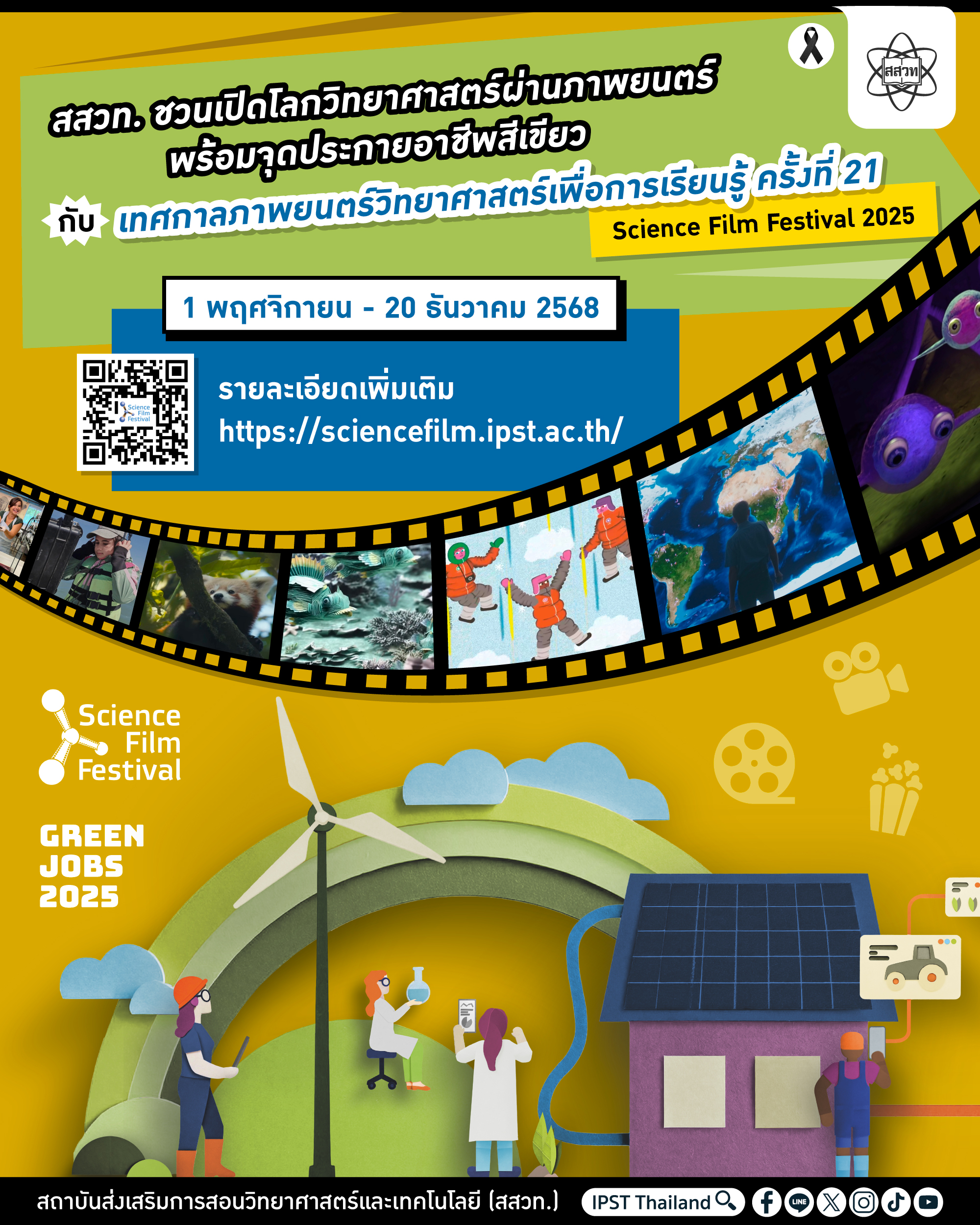 แสง สี เสียง และเรื่องราวแห่งแรงบันดาลใจได้กลับมาอีกครั้ง! กับ “เทศกาลภาพยนตร์วิทยาศาสตร์เพื่อการเรียนรู้ ครั้งที่ 21 (Science Film Festival 2025)” พร้อมพาผู้ชมทุกวัยออกเดินทางสู่โลกของ “วิทยาศาสตร์ที่มีชีวิต” ผ่านภาพยนตร์จากทั่วโลกกว่า 28 เรื่อง จาก 14 ประเทศ ที่จะทำให้ทุกคนเห็นว่าวิทยาศาสตร์ไม่ได้อยู่แค่ในห้องเรียน แต่แทรกอยู่ในทุกมุมของชีวิตจริง เทศกาลในปีนี้มาในแนวคิดสุดทันสมัย “Green Jobs – งานสีเขียว” เพื่อจุดประกายเยาวชนให้ตระหนักถึงอาชีพแห่งอนาคตที่เติบโตคู่กับการดูแลรักษ์โลก และชวนทุกคนค้นหาอาชีพแห่งอนาคตที่ยั่งยืนและเป็นมิตรต่อสิ่งแวดล้อม พร้อมทั้งกิจกรรมฉายภาพยนตร์ทั่วประเทศ ในระหว่างวันที่ 1 พฤศจิกายน – 20 ธันวาคม 2568 จัดโดยสถาบันส่งเสริมการสอนวิทยาศาสตร์และเทคโนโลยี (สสวท.) ร่วมกับสถาบันเกอเธ่ ประเทศไทย และองค์การพิพิธภัณฑ์วิทยาศาสตร์แห่งชาติ (อพวช.) พร้อมหน่วยงานหลักที่ร่วมจัดและพันธมิตรระดับโลก เพื่อให้ผู้ชมทุกวัยได้เรียนรู้วิทยาศาสตร์ในมุมมองใหม่ที่สนุกและเข้าถึงง่าย