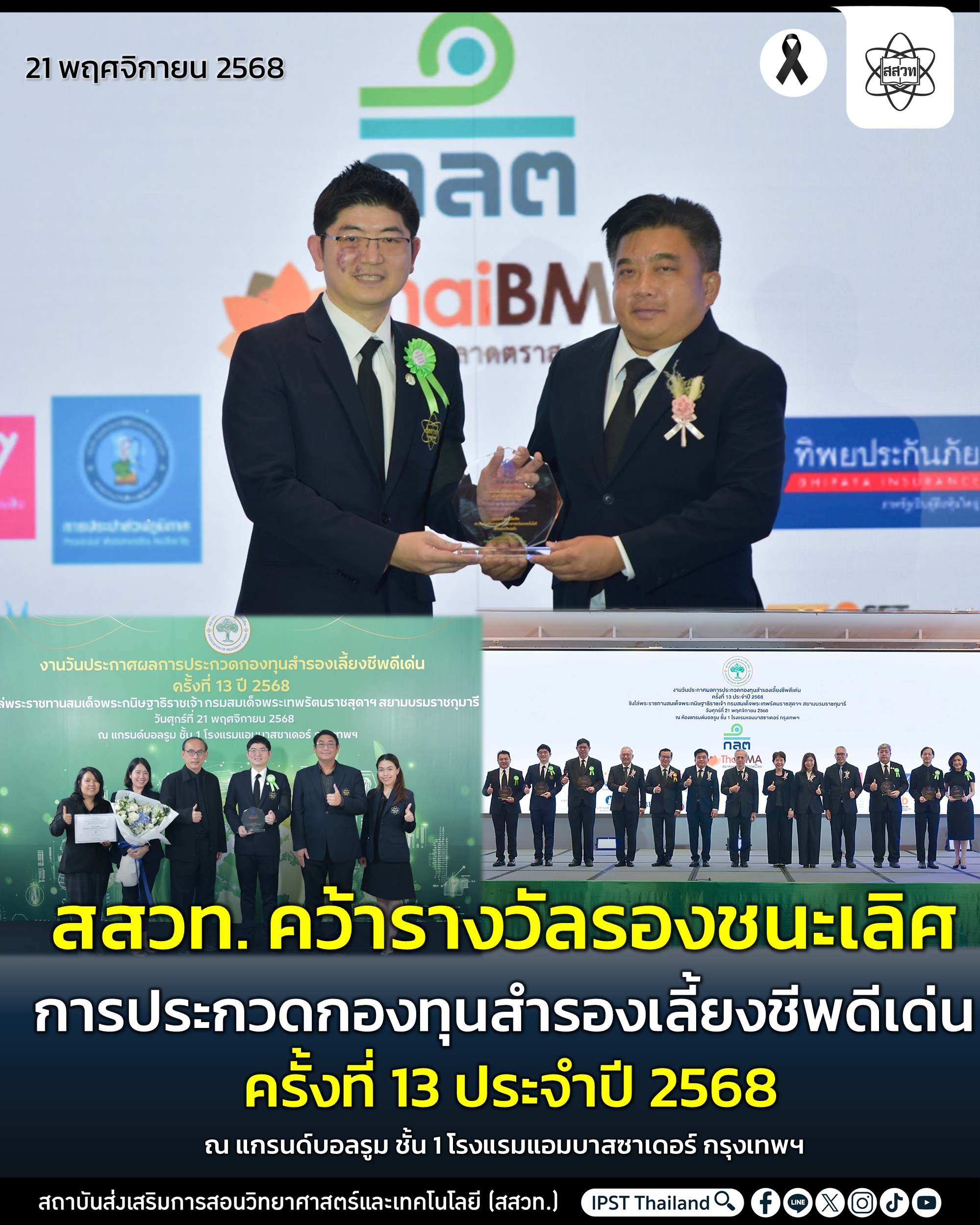 รองศาสตราจารย์ ดร.ธีระเดช เจียรสุขสกุล ผู้อำนวยการสถาบันส่งเสริมการสอนวิทยาศาสตร์และเทคโนโลยี (สสวท.) พร้อมด้วย ดร.ชัยวุฒิ เลิศวนสิริวรรณ ผู้ช่วยผู้อำนวยการ และ พนักงาน เป็นผู้แทนกองทุนสำรองเลี้ยงชีพสถาบันส่งเสริมการสอนวิทยาศาสตร์และเทคโนโลยี ซึ่งจดทะเบียนแล้ว เข้ารับโล่รางวัลจากการเข้าร่วม “โครงการประกวดกองทุนสำรองเลี้ยงชีพดีเด่น ครั้งที่ 13 ประจำปี 258 ชิงโล่พระราชทานสมเด็จพระกนิษฐาธิราชเจ้า กรมสมเด็จพระเทพรัตนราชสุดาฯ สยามบรมราชกุมารี” ผลการคัดเลือกกองทุนสำรองเลี้ยงชีพ สสวท. คว้า “รางวัลรองชนะเลิศ ประเภทกองทุนสำรองเลี้ยงชีพ ประเภทกองทุนเดี่ยว (Single Fund) กลุ่มหน่วยงานรัฐวิสาหกิจ ขนาดกองทุนต่ำกว่า 5,000 ล้านบาท” จัดโดยสมาคมกองทุนสำรองเลี้ยงชีพ เมื่อวันที่ 21 พฤศจิกายน 2568 ณ แกรนด์บอลรูม ชั้น 1 โรงแรมแอมบาสซาเดอร์ กรุงเทพฯ