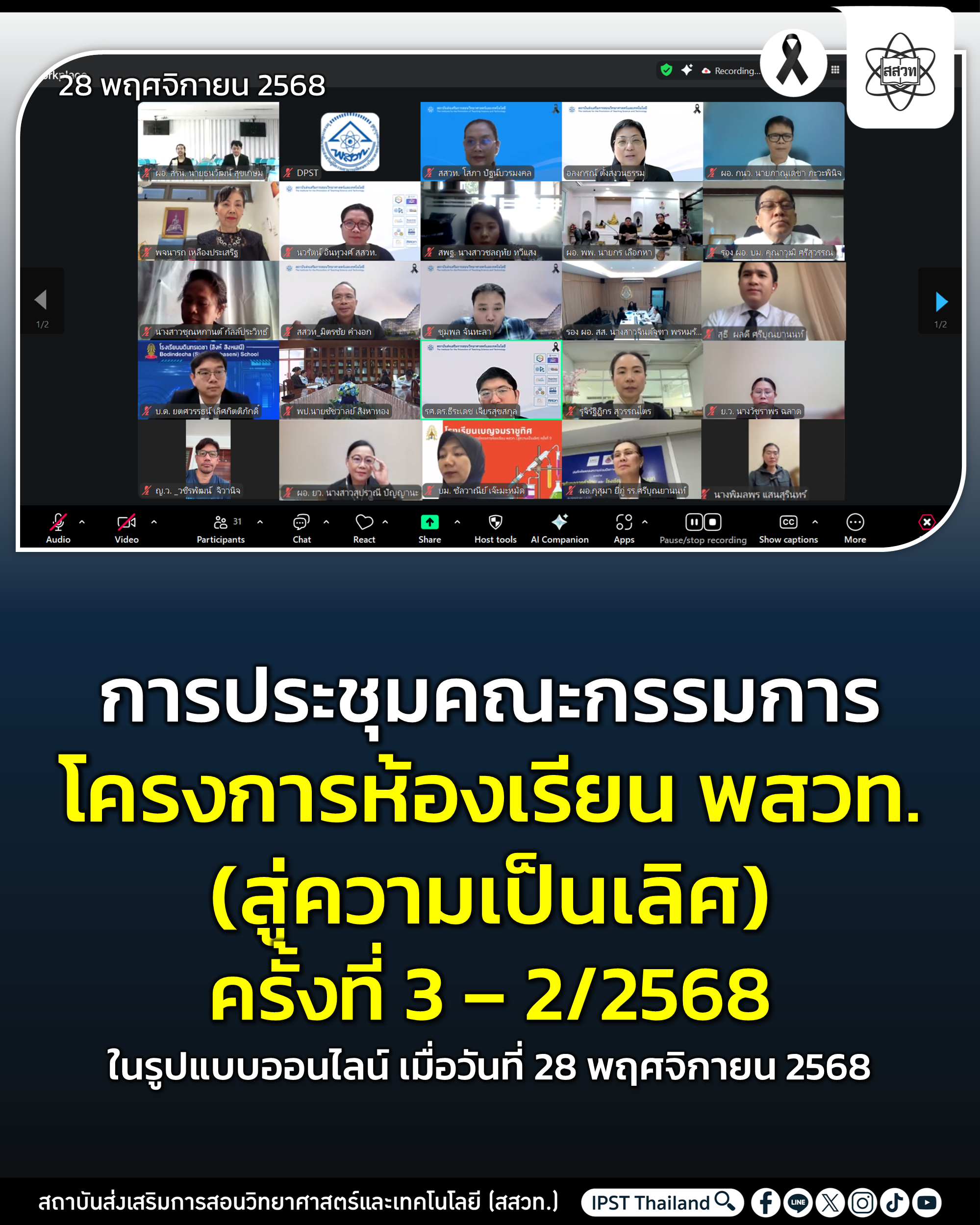 รองศาสตราจารย์ ดร.ธีระเดช เจียรสุขสกุล ผู้อำนวยการสถาบันส่งเสริมการสอนวิทยาศาสตร์และเทคโนโลยี (สสวท.) เป็นประธานในการประชุมคณะกรรมการโครงการห้องเรียน พสวท. (สู่ความเป็นเลิศ) ครั้งที่ 3 – 2/2568 ในรูปแบบออนไลน์ เมื่อวันที่ 28 พฤศจิกายน 2568