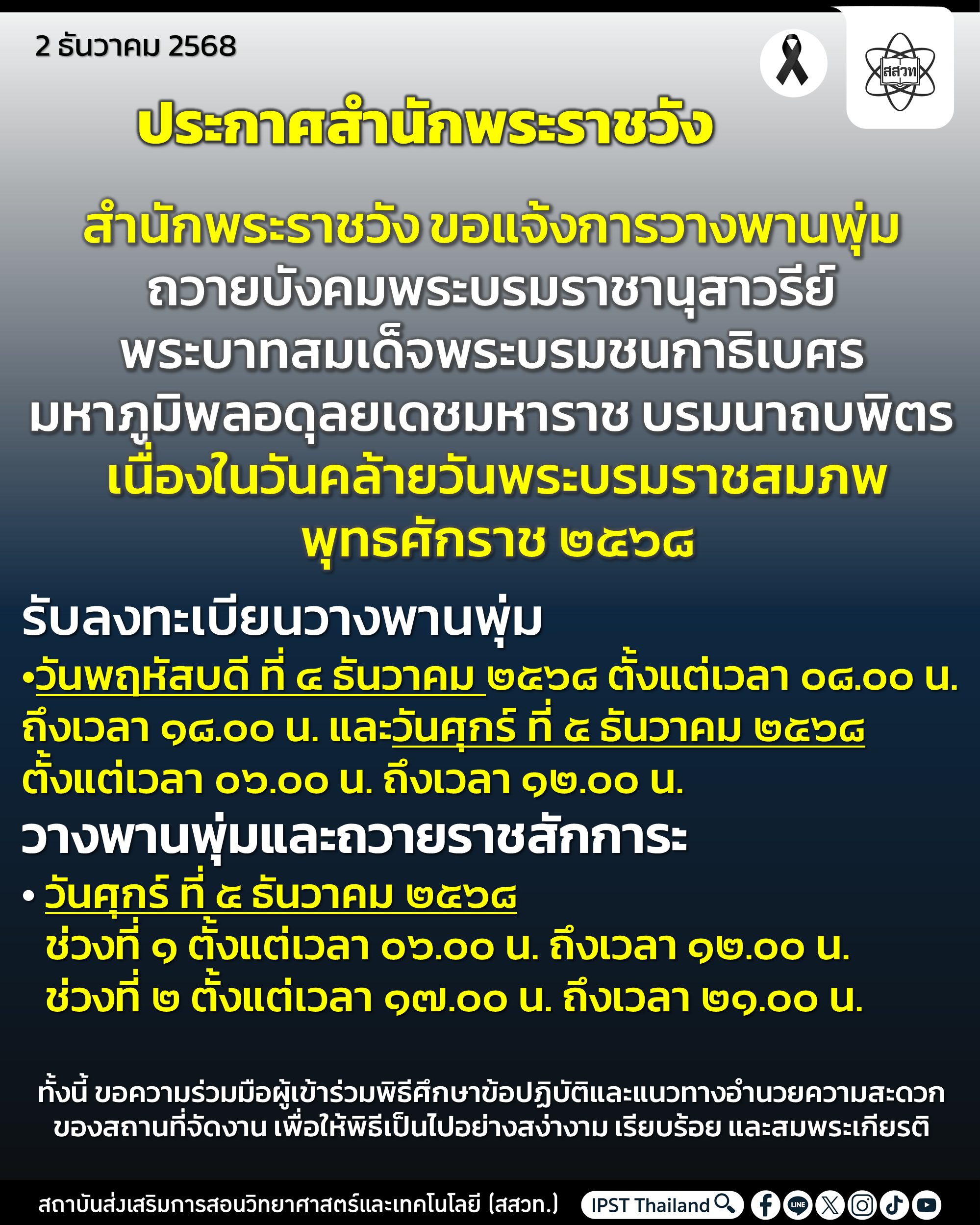 สำนักพระราชวัง ขอแจ้งการวางพานพุ่มถวายบังคมพระบรมราชานุสาวรีย์พระบาทสมเด็จพระบรมชนกาธิเบศร มหาภูมิพลอดุลยเดชมหาราช บรมนาถบพิตร เนื่องในวันคล้ายวันพระบรมราชสมภพ พุทธศักราช ๒๕๖๘ ณ อุทยานเฉลิมพระเกียรติพระบาทสมเด็จพระบรมชนกาธิเบศร มหาภูมิพลอดุลยเดชมหาราช บรมนาถบพิตร ในวันศุกร์ ที่ ๕ ธันวาคม ๒๕๖๘ เพื่อให้การจัดพิธีเป็นไปด้วยความเรียบร้อย สำนักพระราชวังแจ้งให้ผู้ที่ประสงค์จะวางพานพุ่ม โปรดติดต่อแสดงความจำนงที่เจ้าหน้าที่ กองอำนวยการซึ่งประจำอยู่ที่บริเวณอุทยานเฉลิมพระเกียรติฯ รายละเอียดดังนี้