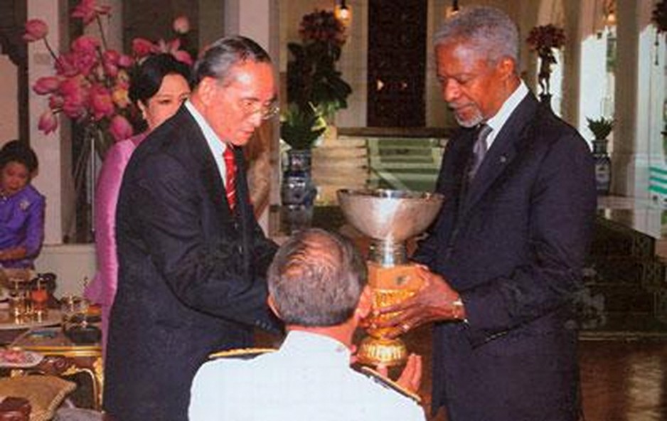 โคฟี อันนัน เลขาธิการสหประชาชาติ (ยูเอ็น) ทูลเกล้าทูลกระหม่อมถวายรางวัล “ความสำเร็จสูงสุด ด้านการพัฒนามนุษย์” (UNDP Human Development Lifetime Achievement Award) ของโครงการพัฒนาแห่งองค์การสหประชาชาติ แด่พระบาทสมเด็จพระเจ้าอยู่หัวเมื่อวันที่ 26 พฤษภาคม 2549 ภาพจาก Positioning Mag