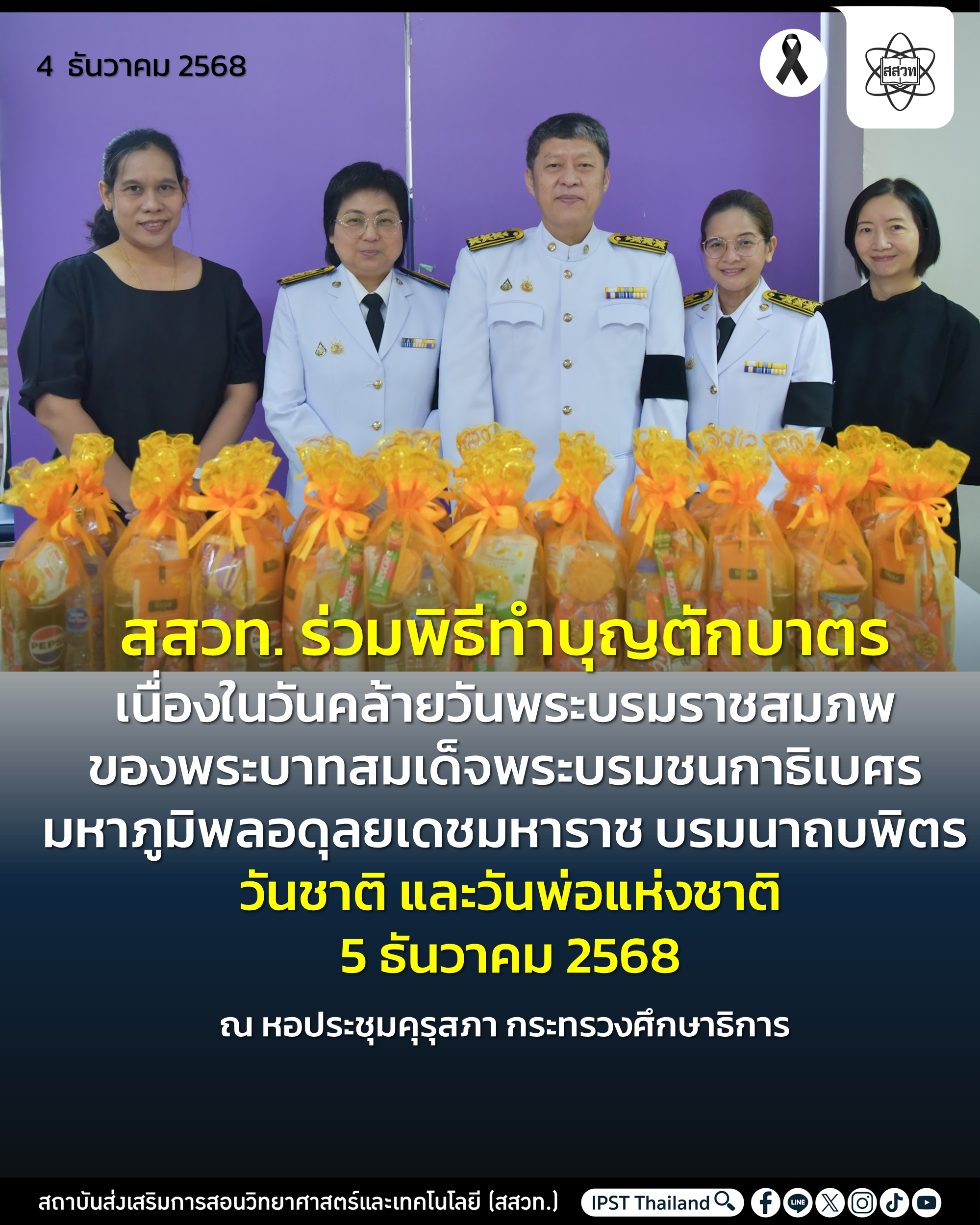 วันที่ 4 ธันวาคม 2568 ณ กระทรวงศึกษาธิการ นายกุลกวี ชินสกุลรัตนชัย ผู้ช่วยผู้อำนวยการสถาบันส่งเสริมการสอนวิทยาศาสตร์และเทคโนโลยี (สสวท.) นำคณะผู้บริหารและพนักงานร่วมกิจกรรม “พิธีทำบุญตักบาตรเนื่องในวันคล้ายวันพระบรมราชสมภพ ของพระบาทสมเด็จพระบรมชนกาธิเบศร มหาภูมิพลอดุลยเดชมหาราช บรมนาถบพิตร วันชาติ และวันพ่อแห่งชาติ 5 ธันวาคม 2568” โดยมี ว่าที่ร้อยตรี ธนุ วงษ์จินดา ข้าราชการการเมืองประจำสำนักเลขาธิการนายกรัฐมนตรี และโฆษกกระทรวงศึกษาธิการ ได้รับมอบหมายจากรัฐมนตรีว่าการ กระทรวงศึกษาธิการ ให้เป็นประธานในพิธี พร้อมด้วย คณะผู้บริหารกระทรวงศึกษาธิการ เข้าร่วมพิธี โดยพร้อมเพรียง ณ หอประชุมคุรุสภา กระทรวงศึกษาธิการ