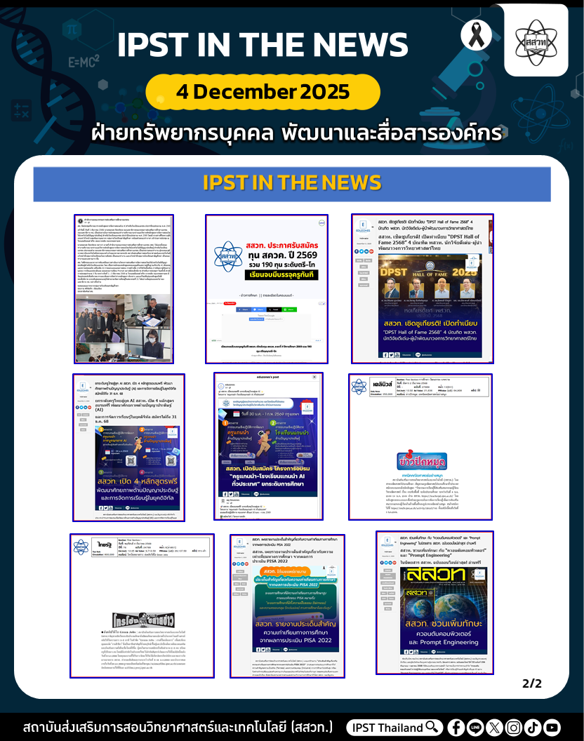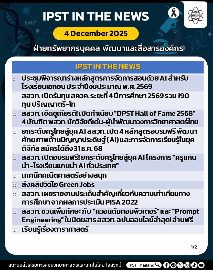 สถาบันส่งเสริมการสอนวิทยาศาสตร์และเทคโนโลยี (สสวท.) ได้ดำเนินงานตามภารกิจอย่างต่อเนื่อง รวมถึงได้ประชาสัมพันธ์ข่าวสารเพื่อให้ครู นักเรียน ผู้ปกครอง และประชาชนทั่วไป ได้รับทราบ เข้าถึงสื่อ ผลงาน กิจกรรม และข่าวต่าง ๆ สสวท. ขอประชาสัมพันธ์ข่าวประจำสัปดาห์ (IPST IN THE NEWS) ระหว่างวันที่ 1 – 4 ธันวาคม 2568 รายละเอียดดังนี้