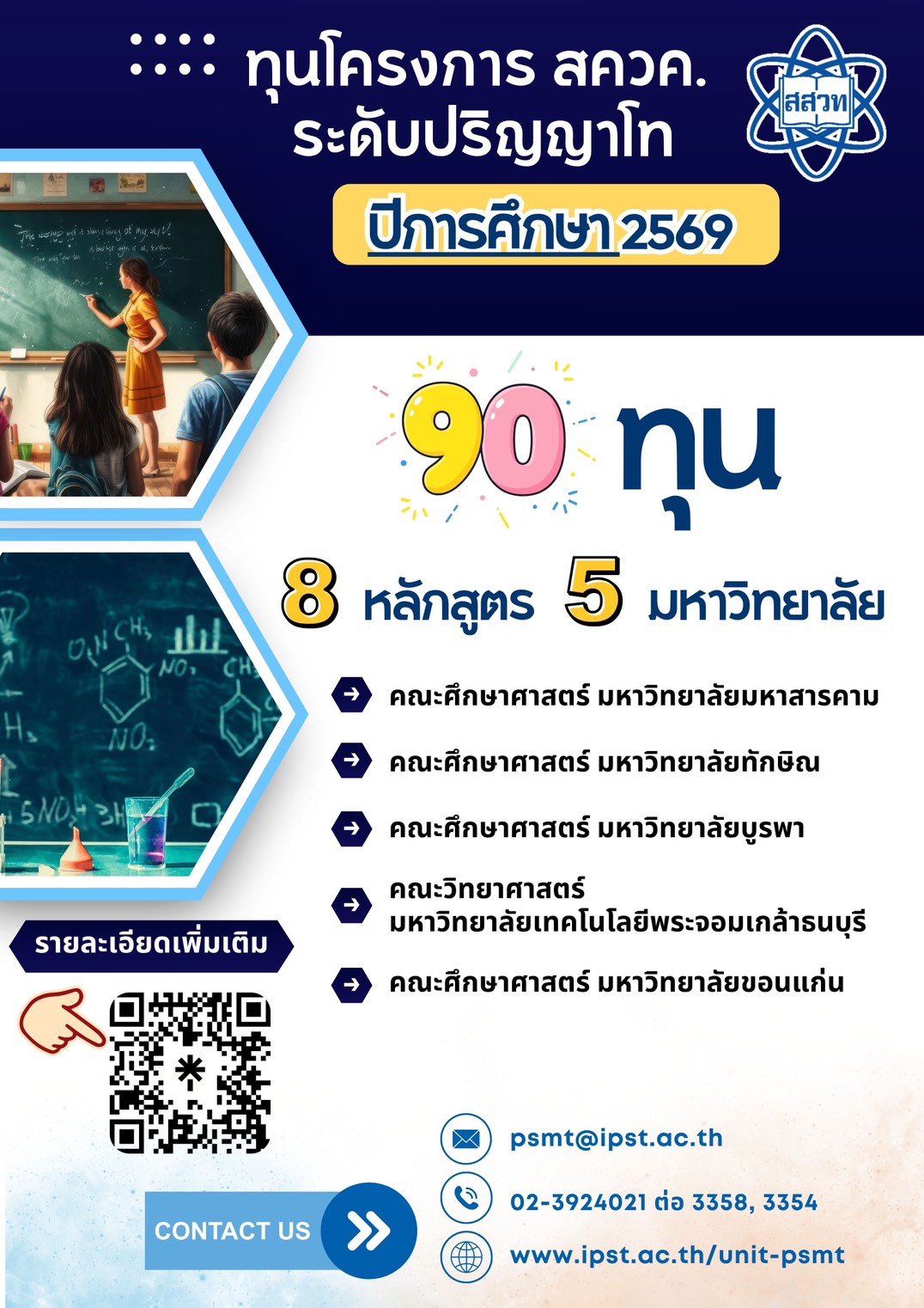 สถาบันส่งเสริมการสอนวิทยาศาสตร์และเทคโนโลยี (สสวท.) เปิดรับสมัครนิสิตนักศึกษาชั้นปีที่ 4 และผู้สำเร็จการศึกษา วท.บ. ที่ตั้งใจเป็น “ครู SMT คุณภาพ” เข้ารับการคัดเลือกทุนโครงการส่งเสริมการผลิตครูที่มีความสามารถพิเศษทางวิทยาศาสตร์และคณิตศาสตร์ (สควค.) ประเภทที่ 2 ระดับปริญญาโท ปีการศึกษา 2569 จำนวน 90 ทุน โดยดำเนินการคัดเลือกร่วมกับมหาวิทยาลัยชั้นนำ 5 แห่ง รวม 8 หลักสูตร เปิดรับสมัคร 2 รอบ โดยรอบที่ 1 เปิดรับสมัครตั้งแต่วันที่ 24 พฤศจิกายน 2568 ถึง วันที่ 8 มกราคม 2569 และ รอบที่ 2 เปิดรับสมัครวันที่ 17 กุมภาพันธ์ 2569 ถึง วันที่ 3 เมษายน 2569 อ่านรายละเอียดได้ที่ https://tr.ee/PuTtft สอบถามที่ฝ่าย สควค. โทร. 0 2392 4921 ต่อ 3358, 3354 และที่อีเมล psmt@ipst.ac.th