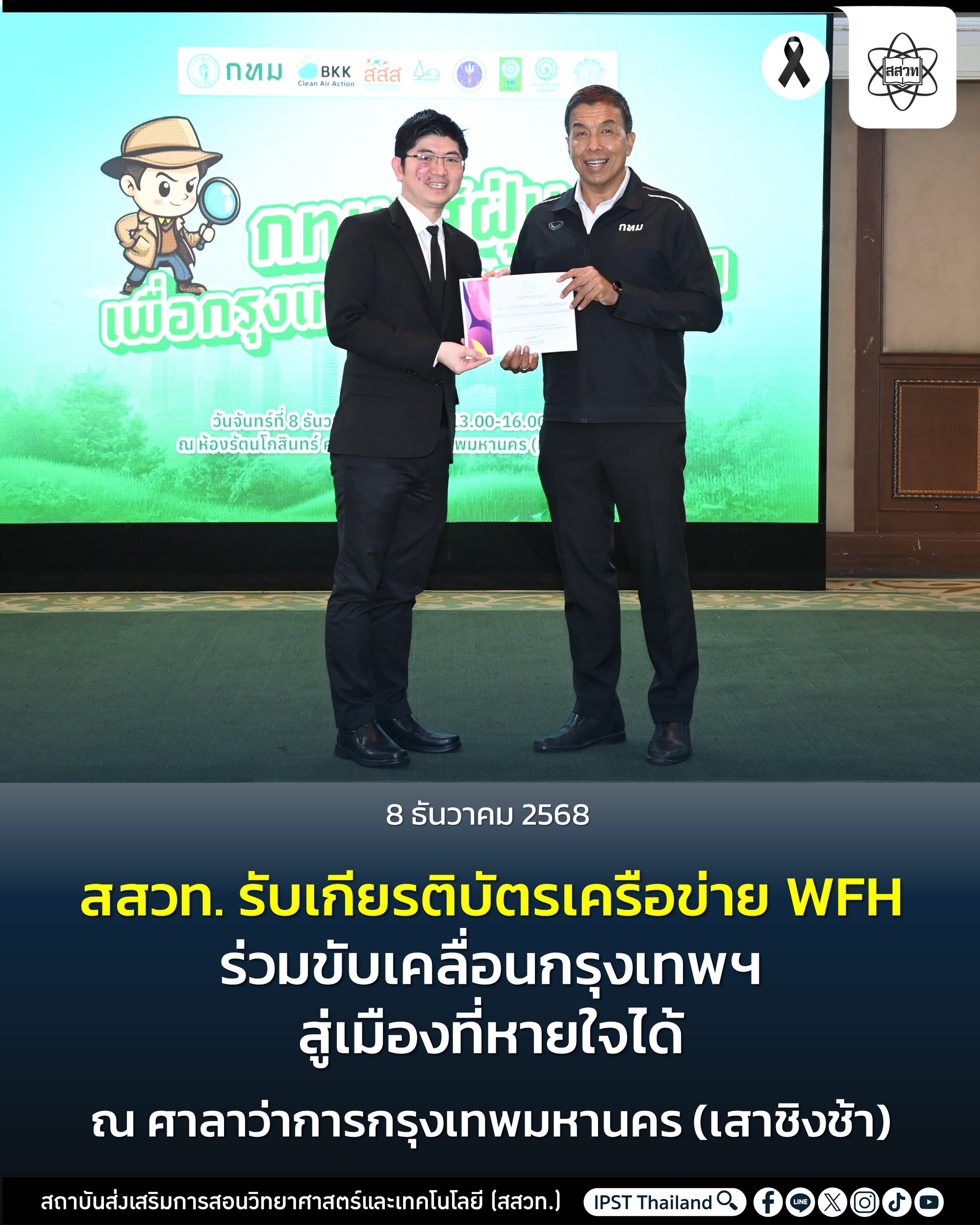 รองศาสตราจารย์ ดร.ธีระเดช เจียรสุขสกุล ผู้อำนวยการสถาบันส่งเสริมการสอนวิทยาศาสตร์และเทคโนโลยี (สสวท.) เป็นผู้แทนหน่วยงานเข้ารับเกียรติบัตร “เครือข่าย Work From Home (WFH)” จาก รองศาสตราจารย์ ดร.ชัชชาติ สิทธิพันธุ์ ผู้ว่าราชการกรุงเทพมหานคร ในกิจกรรม “นักสืบฝุ่น The series สงครามฝุ่นเมือง ครั้งที่ 7” ภายใต้แนวคิด “สู่เป้าหมายเมืองที่หายใจได้” เมื่อวันจันทร์ที่ 8 ธันวาคม 2568 ณ ห้องรัตนโกสินทร์ ศาลาว่าการกรุงเทพมหานคร (เสาชิงช้า)