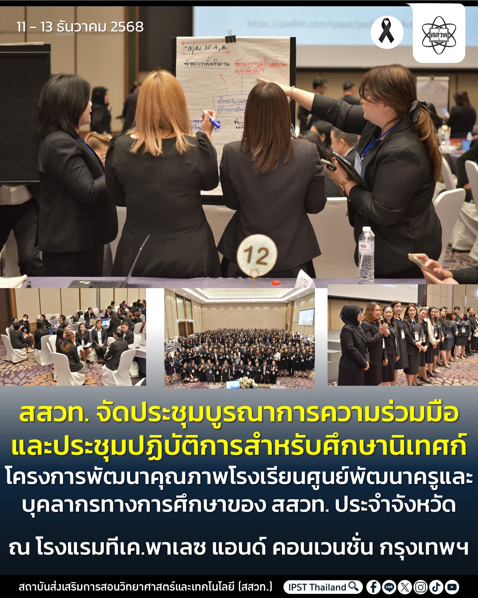 สถาบันส่งเสริมการสอนวิทยาศาสตร์และเทคโนโลยี (สสวท.) จัดการประชุมบูรณาการความร่วมมือและประชุมเชิงปฏิบัติการสำหรับศึกษานิเทศก์ ภายใต้โครงการพัฒนาคุณภาพโรงเรียนศูนย์พัฒนาครูและบุคลากรทางการศึกษาของ สสวท. ประจำจังหวัด เพื่อสร้างต้นแบบการจัดการเรียนรู้ด้านวิทยาศาสตร์ คณิตศาสตร์ และเทคโนโลยีอย่างมีประสิทธิภาพ ระหว่างวันที่ 11 – 13 ธันวาคม 2568 ณ โรงแรมทีเค พาเลซ คอนเวนชั่น กรุงเทพฯ