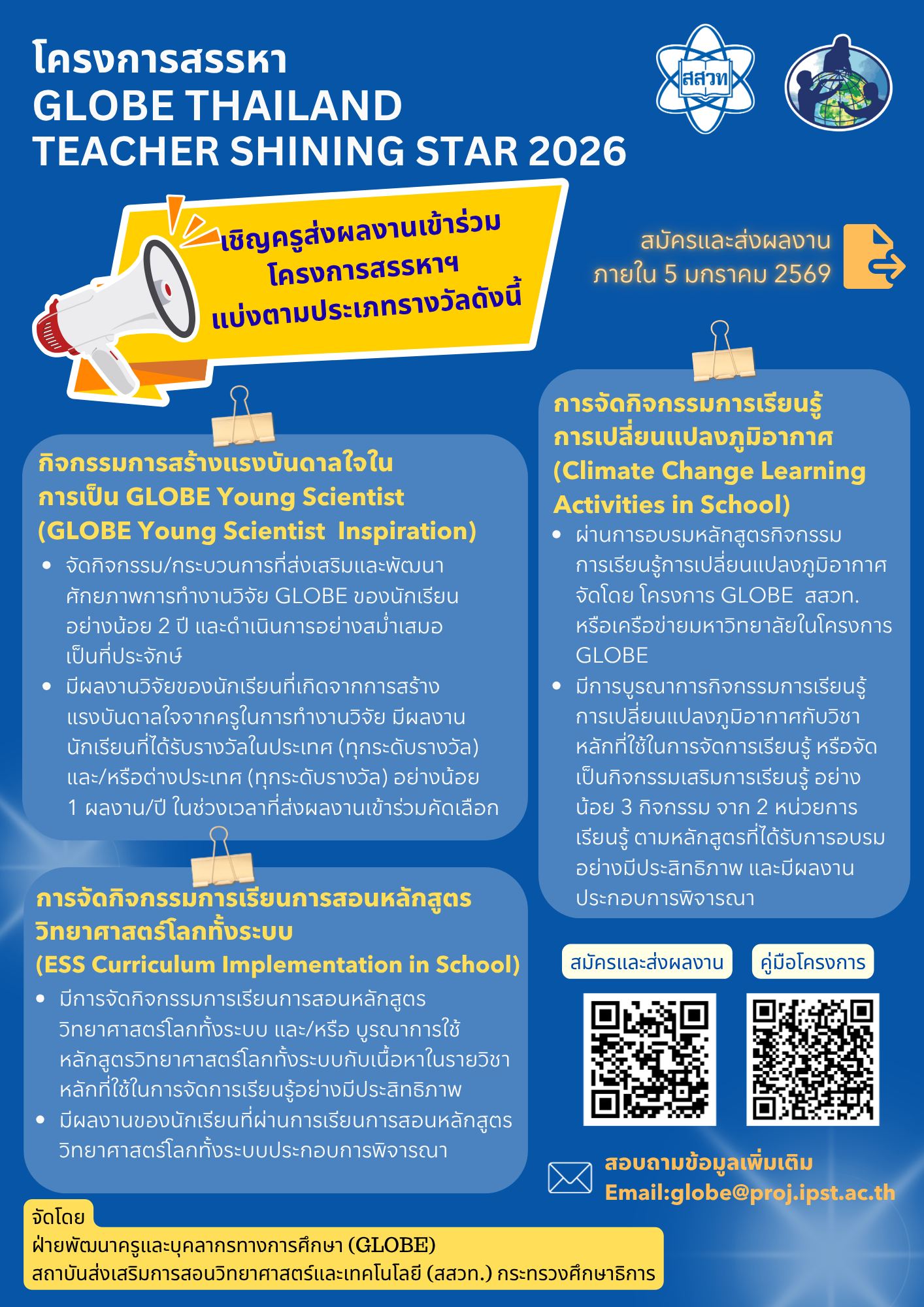 สถาบันส่งเสริมการสอนวิทยาศาสตร์และเทคโนโลยี (สสวท.) เปิดรับสมัครครูผู้สอนระดับประถมศึกษาและมัธยมศึกษา เข้าร่วมโครงการ GLOBE Thailand Teacher Shining Star (GLOBE TSS) 2026 เพื่อสรรหาดาวดวงใหม่ครูไทยหัวใจวิทยาศาสตร์สิ่งแวดล้อม ดูรายละเอียดที่เพจ Facebook: GLOBE Thailand หมดเขตรับสมัครวันที่ 5 มกราคม 2569 สอบถามเพิ่มเติมได้ทางอีเมล globe@proj.ipst.ac.th