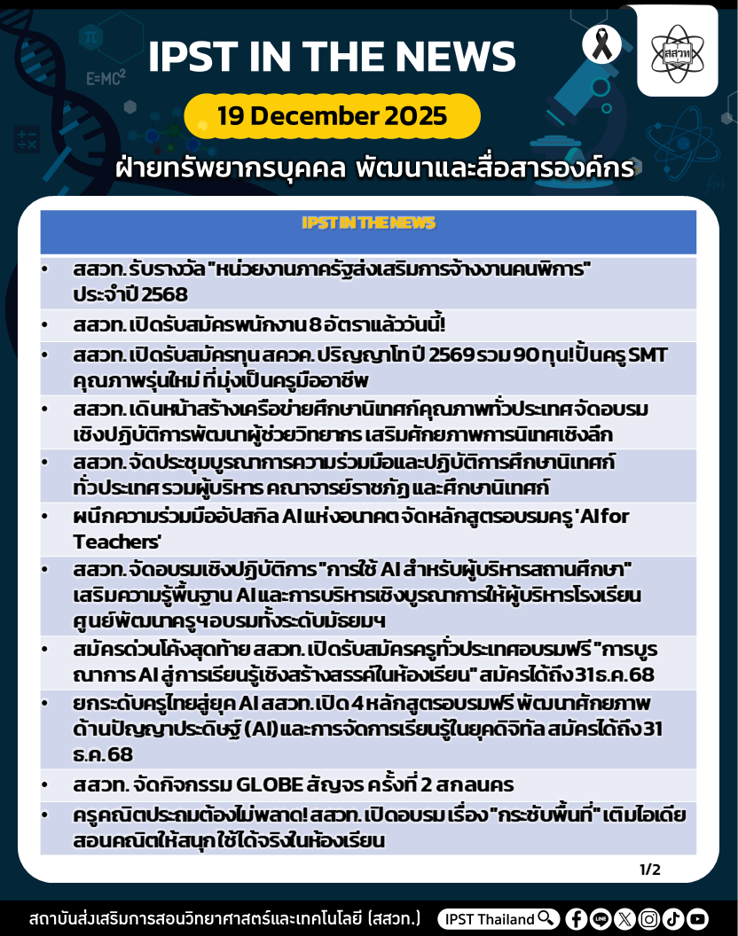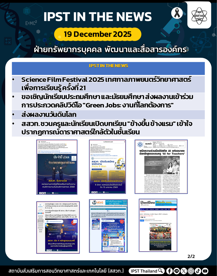 สถาบันส่งเสริมการสอนวิทยาศาสตร์และเทคโนโลยี (สสวท.) ได้ดำเนินงานตามภารกิจอย่างต่อเนื่อง รวมถึงได้ประชาสัมพันธ์ข่าวสารเพื่อให้ครู นักเรียน ผู้ปกครอง และประชาชนทั่วไป ได้รับทราบ เข้าถึงสื่อ ผลงาน กิจกรรม และข่าวต่าง ๆ สสวท. ขอประชาสัมพันธ์ข่าวประจำสัปดาห์ (IPST IN THE NEWS) ระหว่างวันที่ 15-19 ธันวาคม 2568 รายละเอียดดังนี้