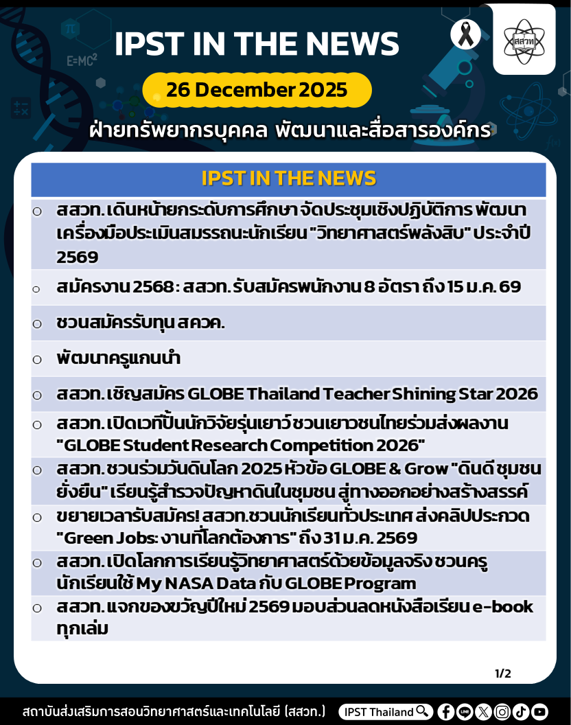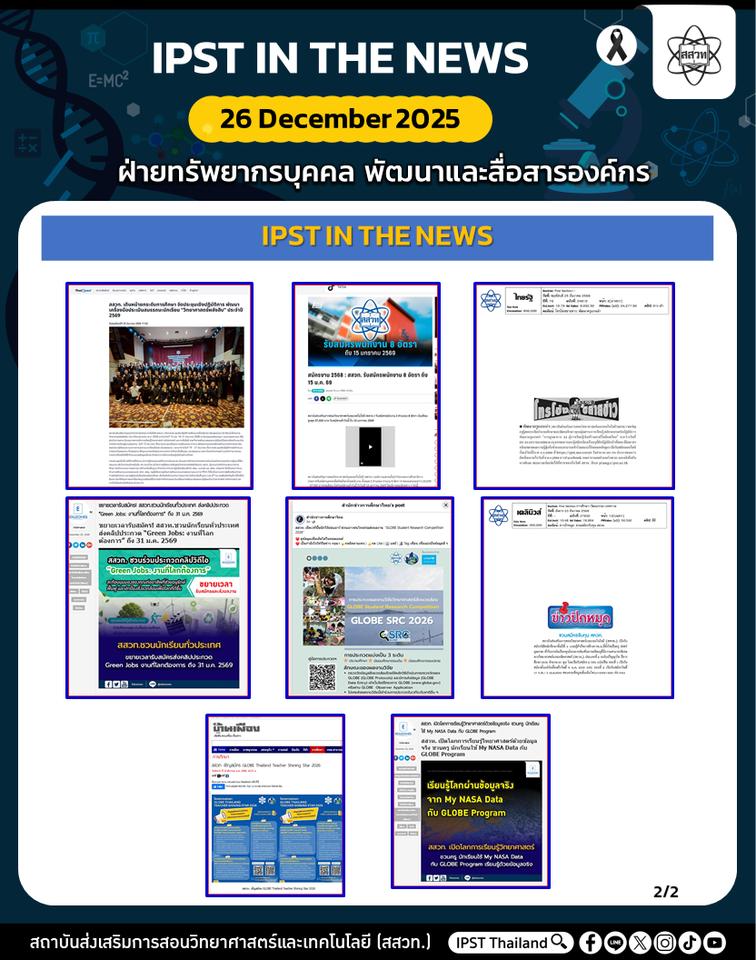 สถาบันส่งเสริมการสอนวิทยาศาสตร์และเทคโนโลยี (สสวท.) ได้ดำเนินงานตามภารกิจอย่างต่อเนื่อง รวมถึงได้ประชาสัมพันธ์ข่าวสารเพื่อให้ครู นักเรียน ผู้ปกครอง และประชาชนทั่วไป ได้รับทราบ เข้าถึงสื่อ ผลงาน กิจกรรม และข่าวต่าง ๆ สสวท. ขอประชาสัมพันธ์ข่าวประจำสัปดาห์ (IPST IN THE NEWS) ระหว่างวันที่ 22-26 ธันวาคม 2568 รายละเอียดดังนี้