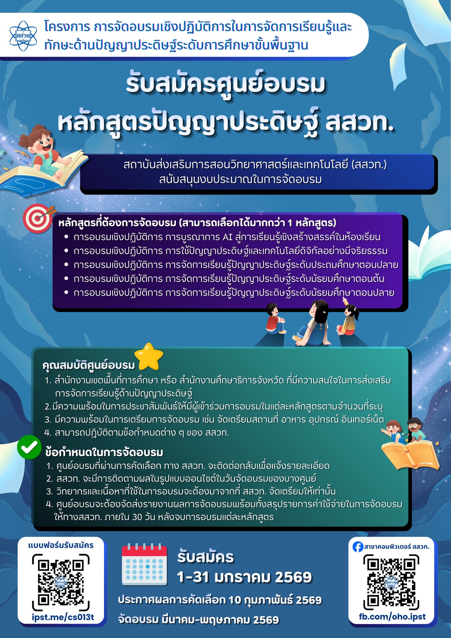 สถาบันส่งเสริมการสอนวิทยาศาสตร์และเทคโนโลยี (สสวท.) ขอเชิญสำนักงานเขตพื้นที่การศึกษา และสำนักงานศึกษาธิการจังหวัดทั่วประเทศ สมัครเป็นศูนย์อบรมหลักสูตรปัญญาประดิษฐ์ สสวท. โดย สสวท. สนับสนุนงบประมาณในการจัดอบรม เพื่อส่งเสริมการให้ความรู้ด้านปัญญาประดิษฐ์ และสร้างเครือข่ายในการส่งเสริมการจัดการเรียนรู้ด้านปัญญาประดิษฐ์ รวมถึงยกระดับศักยภาพครูและการเรียนรู้ของผู้เรียนให้มีความรู้ความสามารถเท่าทันต่อการเปลี่ยนแปลงของสังคมโลกและทัดเทียมกับนานาชาติ เปิดรับสมัครตั้งแต่วันนี้ ถึง 31 มกราคม 2569 ผ่านแบบฟอร์มออนไลน์ที่ https://ipst.me/cs013t ประกาศผลการคัดเลือก วันที่ 10 กุมภาพันธ์ 2569 และจะจัดอบรมในช่วงเดือนมีนาคม–พฤษภาคม 2569 ดูรายละเอียดเพิ่มเติมได้ที่เพจ สาขาคอมพิวเตอร์ สสวท. https://www.facebook.com/oho.ipst