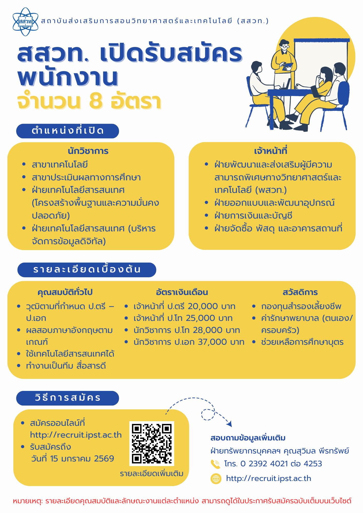 สถาบันส่งเสริมการสอนวิทยาศาสตร์และเทคโนโลยี (สสวท.) เปิดรับสมัครบุคคลเพื่อคัดเลือกเป็นพนักงาน 2 ตำแหน่ง รวมจำนวน 8 อัตรา ประกอบด้วย นักวิชาการ 4 อัตรา สาขาเทคโนโลยีสาขาประเมินผลทางการศึกษา ฝ่ายเทคโนโลยีสารสนเทศ (โครงสร้างพื้นฐานและความมั่นคงปลอดภัย)ฝ่ายเทคโนโลยีสารสนเทศ (บริหารจัดการข้อมูลดิจิทัล) และ เจ้าหน้าที่ 4 อัตรา ฝ่ายพัฒนาและส่งเสริมผู้มีความสามารถพิเศษทางวิทยาศาสตร์และเทคโนโลยี (พสวท.) ฝ่ายออกแบบและพัฒนาอุปกรณ์ ฝ่ายการเงินและบัญชี ฝ่ายจัดซื้อ พัสดุและอาคารสถานที่ ผู้สมัครต้องสำเร็จการศึกษาตั้งแต่ระดับปริญญาตรีถึงปริญญาเอก คุณสมบัติตามที่ สสวท. ประกาศ เงินเดือนเริ่มต้น 20,000–37,000 บาท พร้อมสวัสดิการกองทุนสำรองเลี้ยงชีพ ค่ารักษาพยาบาล และช่วยเหลือการศึกษาบุตรสมัครออนไลน์ได้ตั้งแต่วันนี้ถึงวันที่ 15 มกราคม 2569 ผ่านเว็บไซต์ http://recruit.ipst.ac.th สอบถามรายละเอียดที่ฝ่ายทรัพยากรบุคคล ฯ โทร. 0 2392 4021 ต่อ 4253 (คุณสุวิมล พีรทรัพย์)