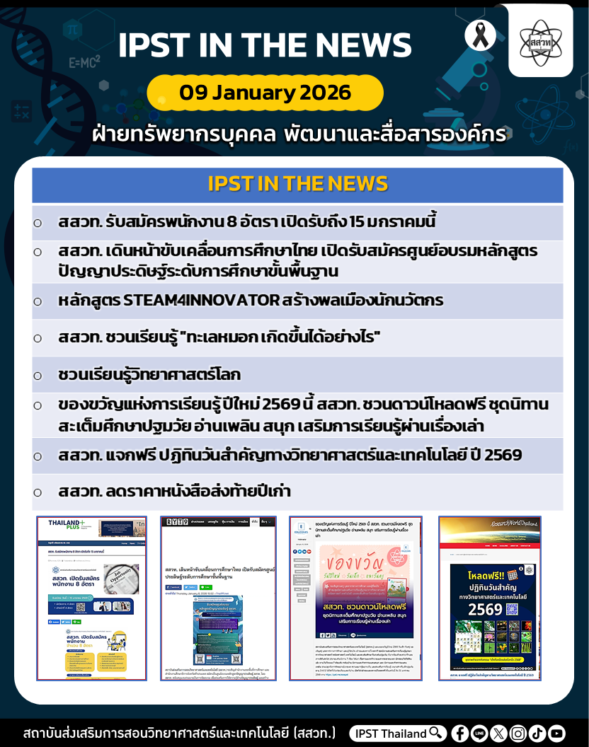 สถาบันส่งเสริมการสอนวิทยาศาสตร์และเทคโนโลยี (สสวท.) ได้ดำเนินงานตามภารกิจอย่างต่อเนื่อง รวมถึงได้ประชาสัมพันธ์ข่าวสารเพื่อให้ครู นักเรียน ผู้ปกครอง และประชาชนทั่วไป ได้รับทราบ เข้าถึงสื่อ ผลงาน กิจกรรม และข่าวต่าง ๆ สสวท. ขอประชาสัมพันธ์ข่าวประจำสัปดาห์ (IPST IN THE NEWS) ระหว่างวันที่ 5 – 9 มกราคม 2569 รายละเอียดดังนี้