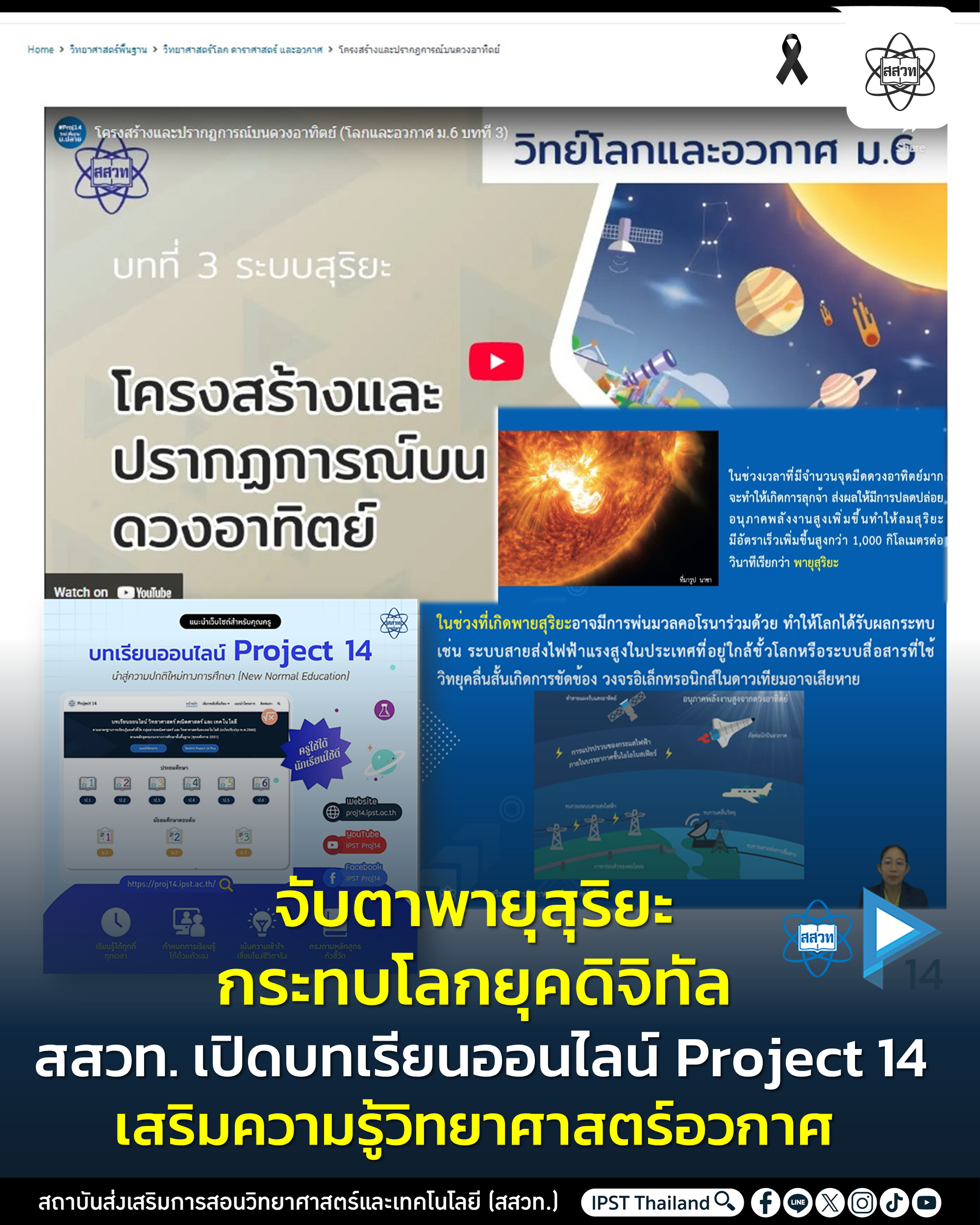 ท่ามกลางความสนใจของนานาชาติต่อปรากฏการณ์ พายุสุริยะ (Solar Storm) และ ลมสุริยะ (Solar Wind) ที่ส่งผลกระทบต่อเทคโนโลยีและระบบสื่อสารของโลกในปัจจุบัน สถาบันส่งเสริมการสอนวิทยาศาสตร์และเทคโนโลยี (สสวท.) ขอเชิญชวนครู นักเรียน และประชาชนทั่วไป เปิดโลกการเรียนรู้ปรากฏการณ์ทางฟิสิกส์จากดวงอาทิตย์ เพื่อทำความเข้าใจกลไกการเกิดพายุสุริยะ บทบาทของแรงแม่เหล็ก และการทำงานของสนามแม่เหล็กโลกที่เปรียบเสมือนเกราะป้องกันโลกจากอนุภาคมีประจุพลังงานสูง ผ่านบทเรียนออนไลน์ Project 14 สื่อการเรียนรู้ที่อธิบายอย่างเป็นระบบ เข้าใจง่าย เชื่อมโยงหลักการฟิสิกส์กับสถานการณ์จริง ช่วยเสริมสร้างทักษะการรู้เท่าทันวิทยาศาสตร์ และเตรียมความพร้อมรับมือผลกระทบจากปรากฏการณ์อวกาศในยุคดิจิทัล ผู้สนใจสามารถเรียนรู้เพิ่มเติมได้จาก หนังสือเรียนรายวิชาพื้นฐานวิทยาศาสตร์และเทคโนโลยี วิทยาศาสตร์โลกและอวกาศ ม.6 และวิดีทัศน์บทเรียนออนไลน์ ทางเว็บไซต์ Project 14 ได้ฟรีทุกที่ ทุกเวลา คลิกได้ที่ https://proj14.ipst.ac.th/m4-6-sci-basic/earth-science/earth-m6-008/
