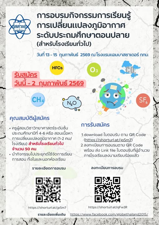 สถาบันส่งเสริมการสอนวิทยาศาสตร์และเทคโนโลยี (สสวท.) เปิดรับสมัครครูระดับประถมศึกษาตอนปลาย เข้ารับการอบรม “กิจกรรมการเรียนรู้การเปลี่ยนแปลงภูมิอากาศ ระดับประถมศึกษาตอนปลาย (สำหรับโรงเรียนทั่วไป)” ระหว่างวันที่ 13–15 กุมภาพันธ์ 2569 ณ โรงแรมแอมบาสซาเดอร์ สุขุมวิท กรุงเทพฯ เพื่อเสริมสร้างความรู้ความเข้าใจ และแนวทางการจัดการเรียนรู้ด้านการเปลี่ยนแปลงภูมิอากาศที่สามารถนำไปประยุกต์ใช้ได้จริงทั้งในและนอกห้องเรียน เตรียมพร้อมรับมือวิกฤตโลกร้อน โดย สสวท. สนับสนุนค่าอาหารกลางวัน อาหารว่าง เอกสารประกอบการอบรม และค่าที่พัก คุณสมบัติผู้สมัครเป็นครูผู้สอนวิชาวิทยาศาสตร์ ป.4–6 หรือสอนเนื้อหาการเปลี่ยนแปลงภูมิอากาศ โรงเรียนละ 1–2 คน สมัครได้ตั้งแต่วันนี้ถึง 2 กุมภาพันธ์ 2569รับจำนวนจำกัด ผู้สนใจสามารถดาวน์โหลดเอกสารและดูรายละเอียดการสมัครได้ที่ https://globethailand.ipst.ac.th/news.php