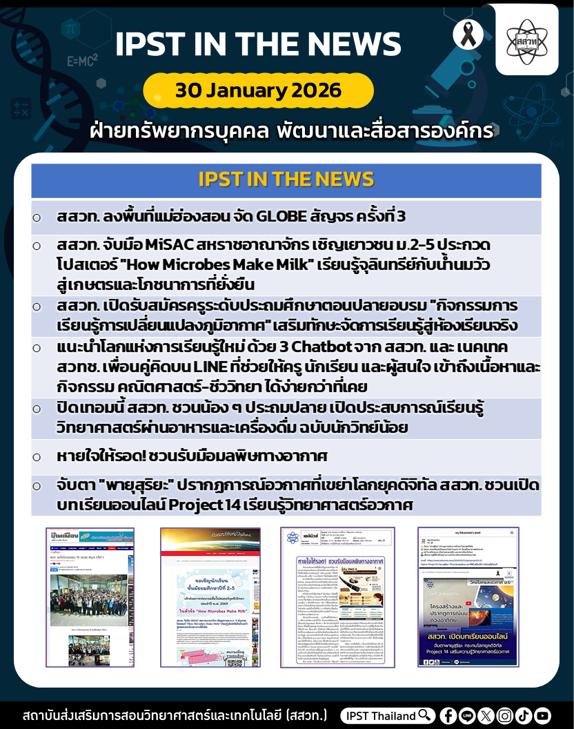 สถาบันส่งเสริมการสอนวิทยาศาสตร์และเทคโนโลยี (สสวท.) ได้ดำเนินงานตามภารกิจอย่างต่อเนื่อง รวมถึงได้ประชาสัมพันธ์ข่าวสารเพื่อให้ครู นักเรียน ผู้ปกครอง และประชาชนทั่วไป ได้รับทราบ เข้าถึงสื่อ ผลงาน กิจกรรม และข่าวต่าง ๆ สสวท. ขอประชาสัมพันธ์ข่าวประจำสัปดาห์ (IPST IN THE NEWS) ระหว่างวันที่ 26-30 มกราคม 2569 รายละเอียดดังนี้