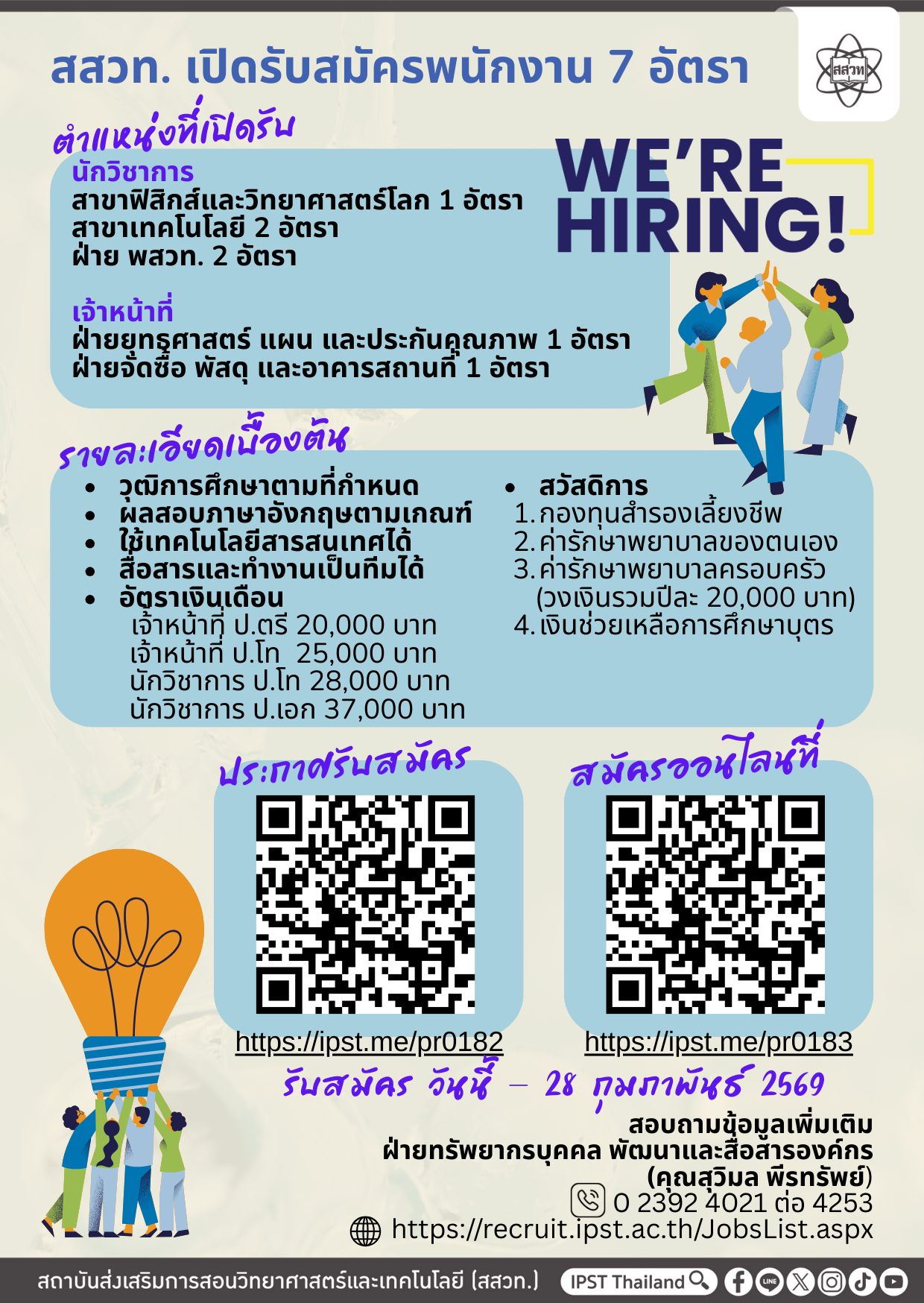 สถาบันส่งเสริมการสอนวิทยาศาสตร์และเทคโนโลยี (สสวท.) ประกาศเปิดรับสมัครบุคคลเพื่อคัดเลือกเป็นพนักงานจำนวน 7 อัตรา ครอบคลุมทั้งสายงานวิชาการและงานสนับสนุน วุฒิการศึกษาตั้งแต่ปริญญาตรีถึงปริญญาเอก อัตราเงินเดือนเริ่มต้น 20,000 – 37,000 บาท พร้อมสวัสดิการที่ตอบโจทย์ความมั่นคง อาทิกองทุนสำรองเลี้ยงชีพ ค่ารักษาพยาบาลตนเองและครอบครัว รวมถึงเงินช่วยเหลือการศึกษาบุตร ผู้สมัครต้องมีคุณสมบัติเฉพาะตำแหน่งและผลคะแนนภาษาอังกฤษตามเกณฑ์ที่กำหนด พร้อมทำงานเป็นทีม อย่ารอช้า!สมัครออนไลน์ได้ตั้งแต่วันนี้ถึงวันที่ 28 กุมภาพันธ์ 2569 ที่เว็บไซต์ https://recruit.ipst.ac.th/JobsList.aspx สอบถามเพิ่มเติมได้ที่ฝ่ายทรัพยากรบุคคล พัฒนาและสื่อสารองค์กร (คุณสุวิมล พีรทรัพย์) โทร. 0 2392 4021 ต่อ 4253 และประกาศรับสมัครคลิกที่นี่ https://ipst.me/pr0182