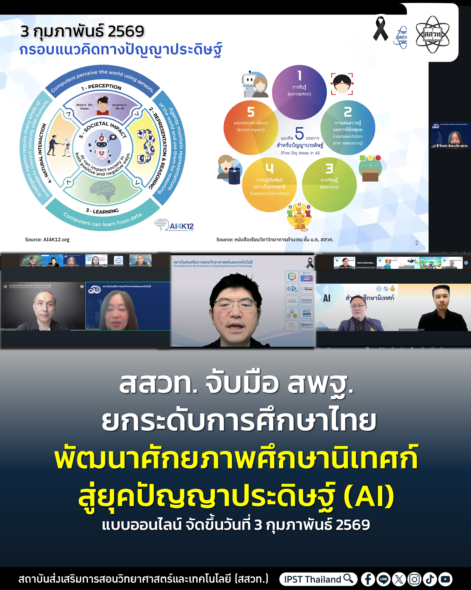 สถาบันส่งเสริมการสอนวิทยาศาสตร์และเทคโนโลยี (สสวท.) ร่วมกับสำนักงานคณะกรรมการการศึกษาขั้นพื้นฐาน (สพฐ.) จัดการอบรมเชิงปฏิบัติการ “การพัฒนาศักยภาพศึกษานิเทศก์ในการจัดการเรียนรู้และทักษะด้านปัญญาประดิษฐ์ (AI) ระดับการศึกษาขั้นพื้นฐาน” โดยมีจุดประสงค์เพื่อเตรียมความพร้อมให้ศึกษานิเทศก์และบุคลากรทางการศึกษาเป็นแกนนำสำคัญในการขับเคลื่อนการเรียนรู้ปัญญาประดิษฐ์